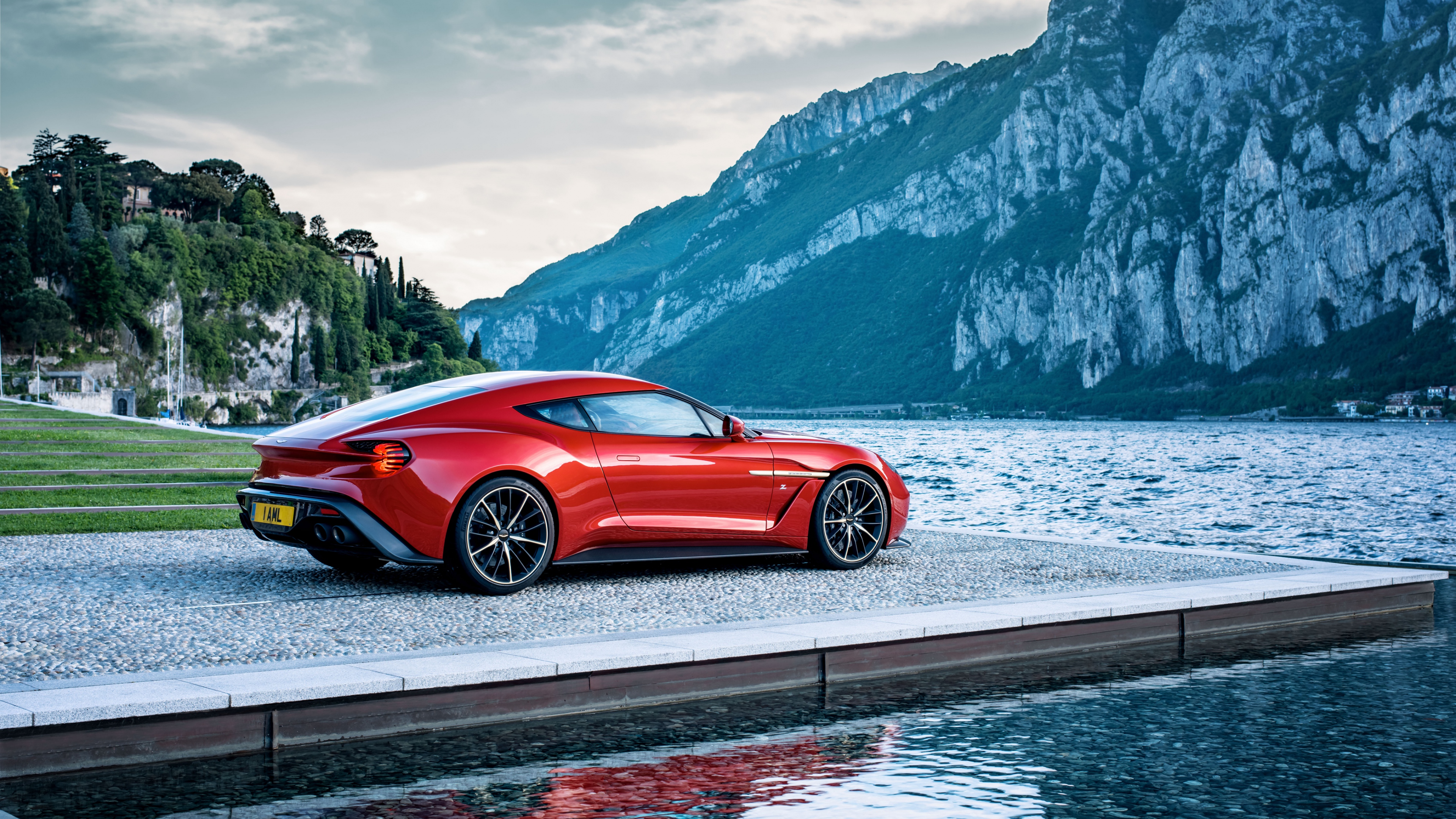 Aston martin vanquish red side view mountain lake 4k wallpaper