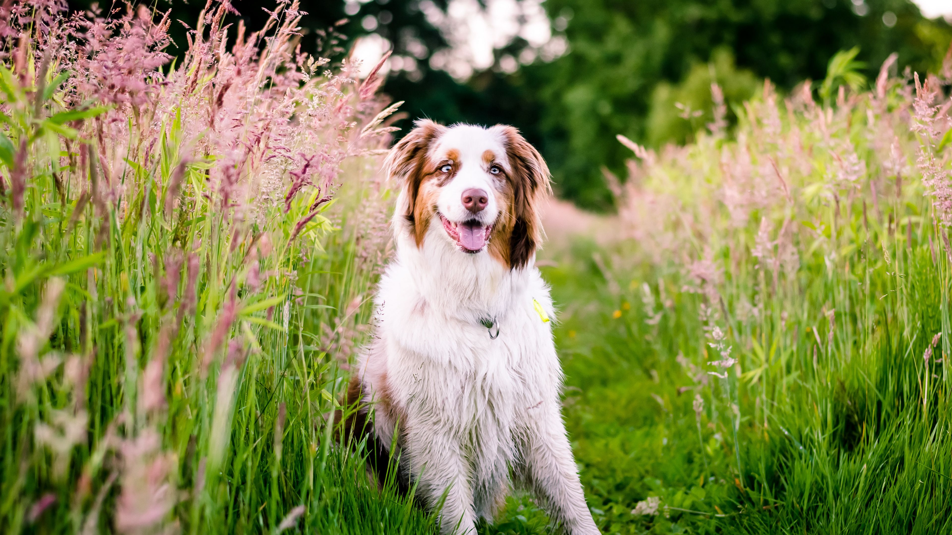 Australian shepherd dog flowers meadow grass nature 4k wallpaper Description :