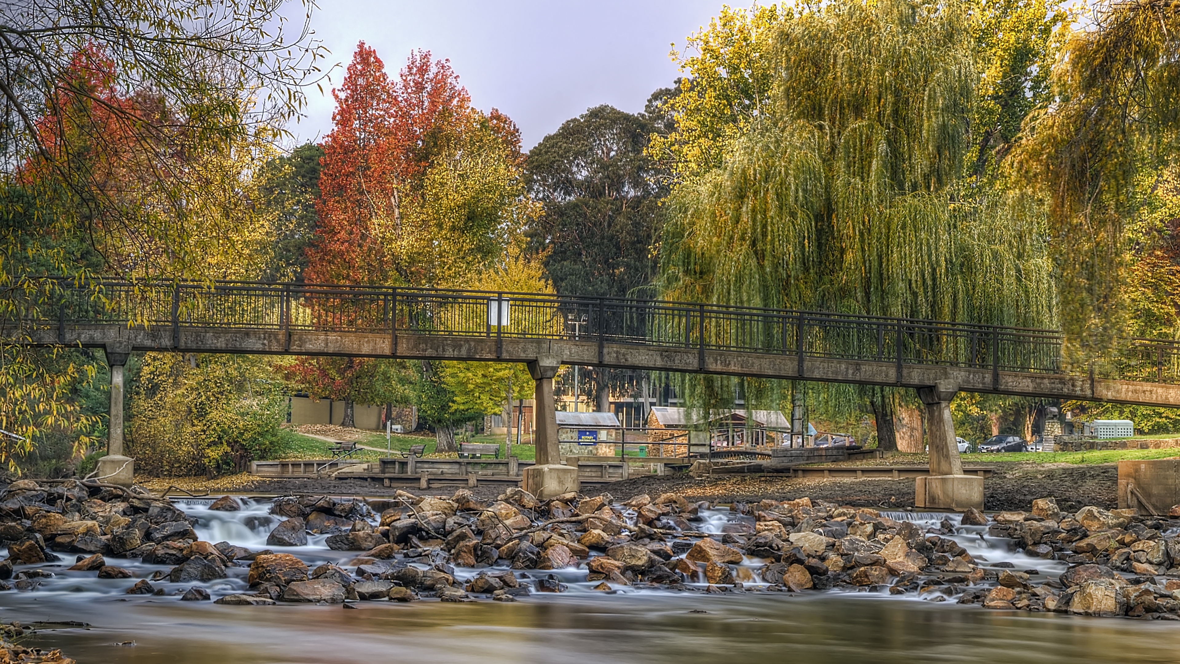 Autumn river bridge trees rocks wallpaper 4k wallpaper Description :