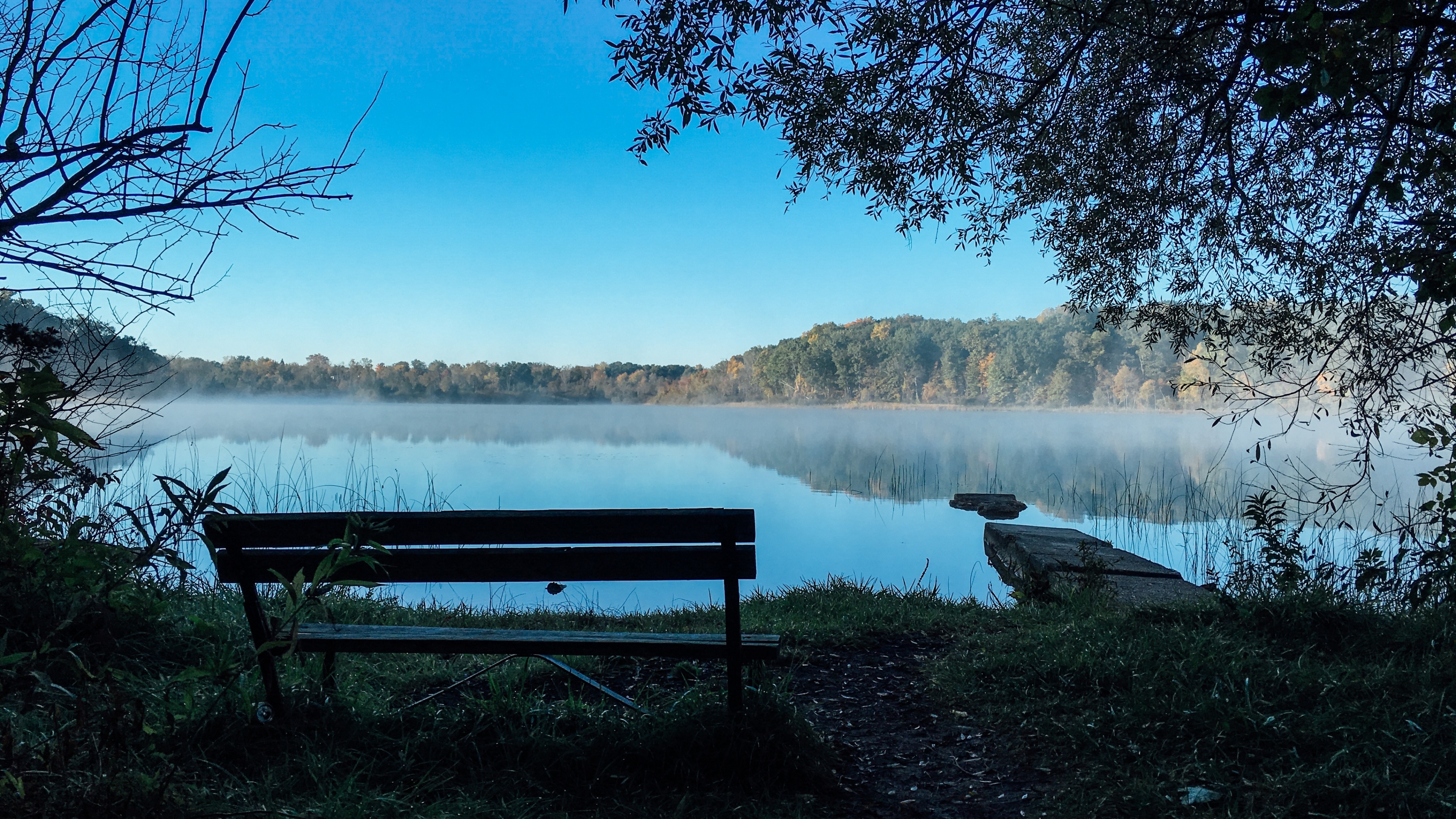 Bench lake landscape trees 4k wallpaper Description :