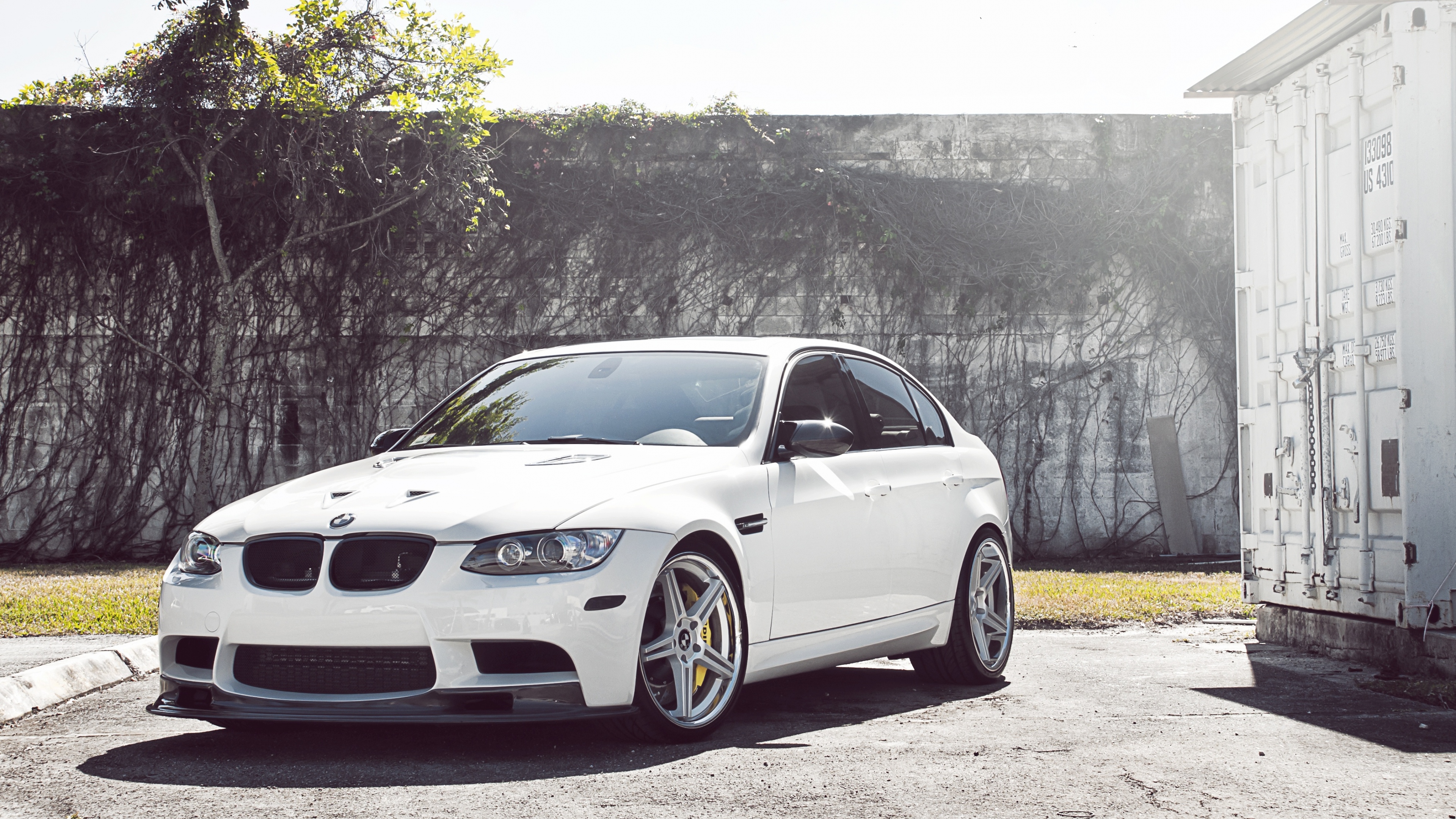 Bmw sedan white wheels tree m3 e90 4k wallpaper