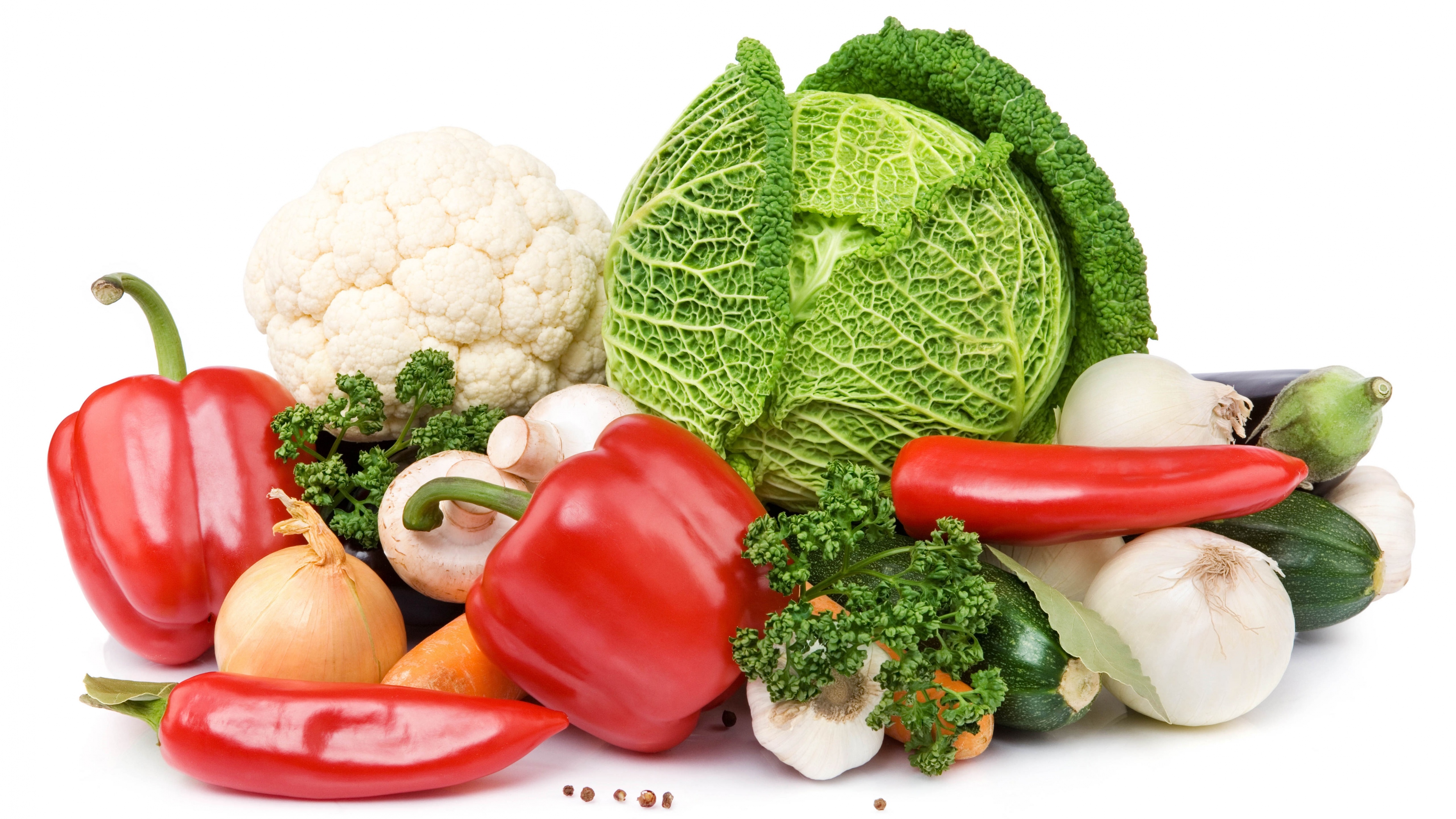 Cabbage peppers eggplant mushrooms carrots white background 4k wallpaper Description :