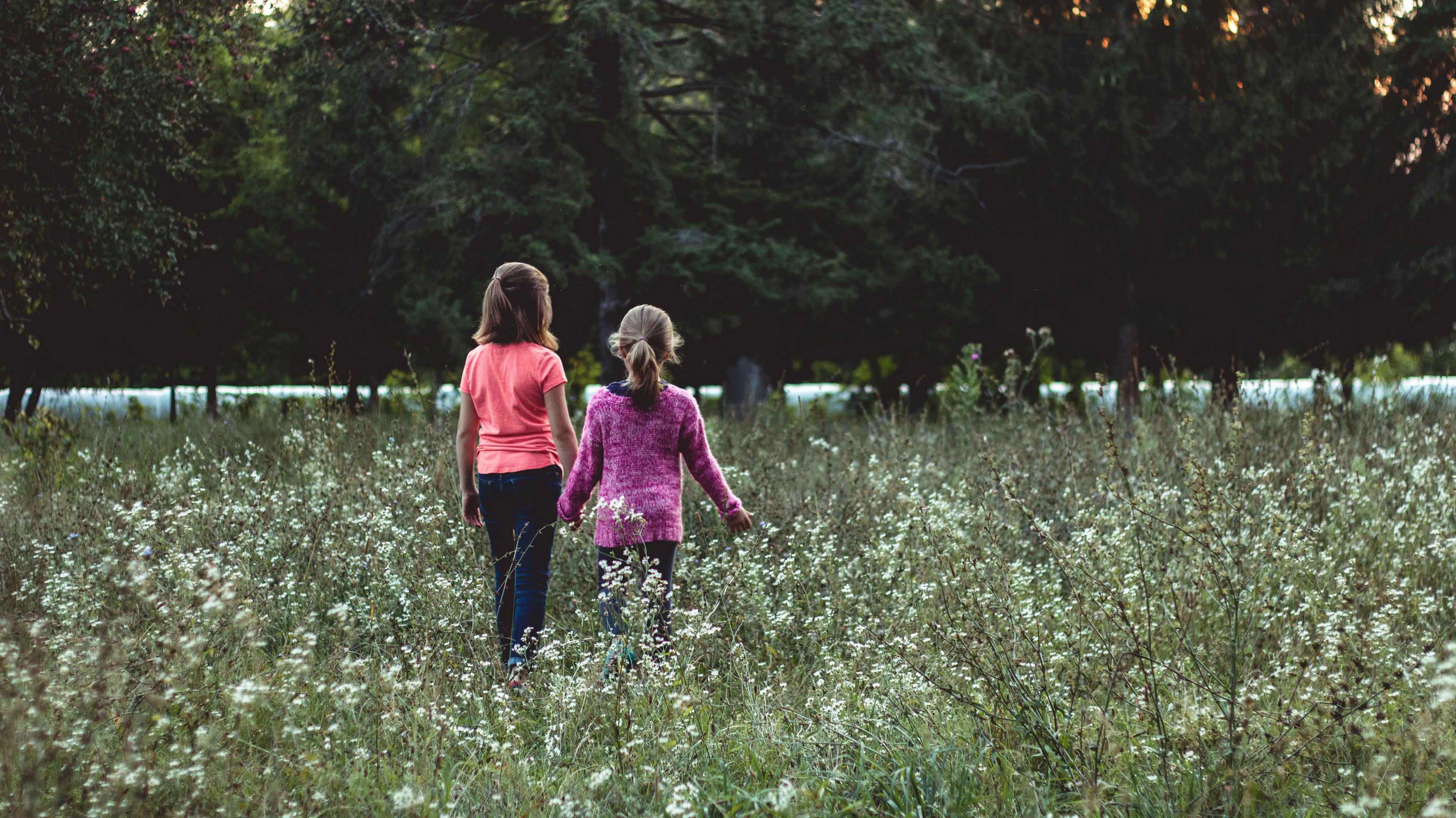 Children field walk friends 4k wallpaper