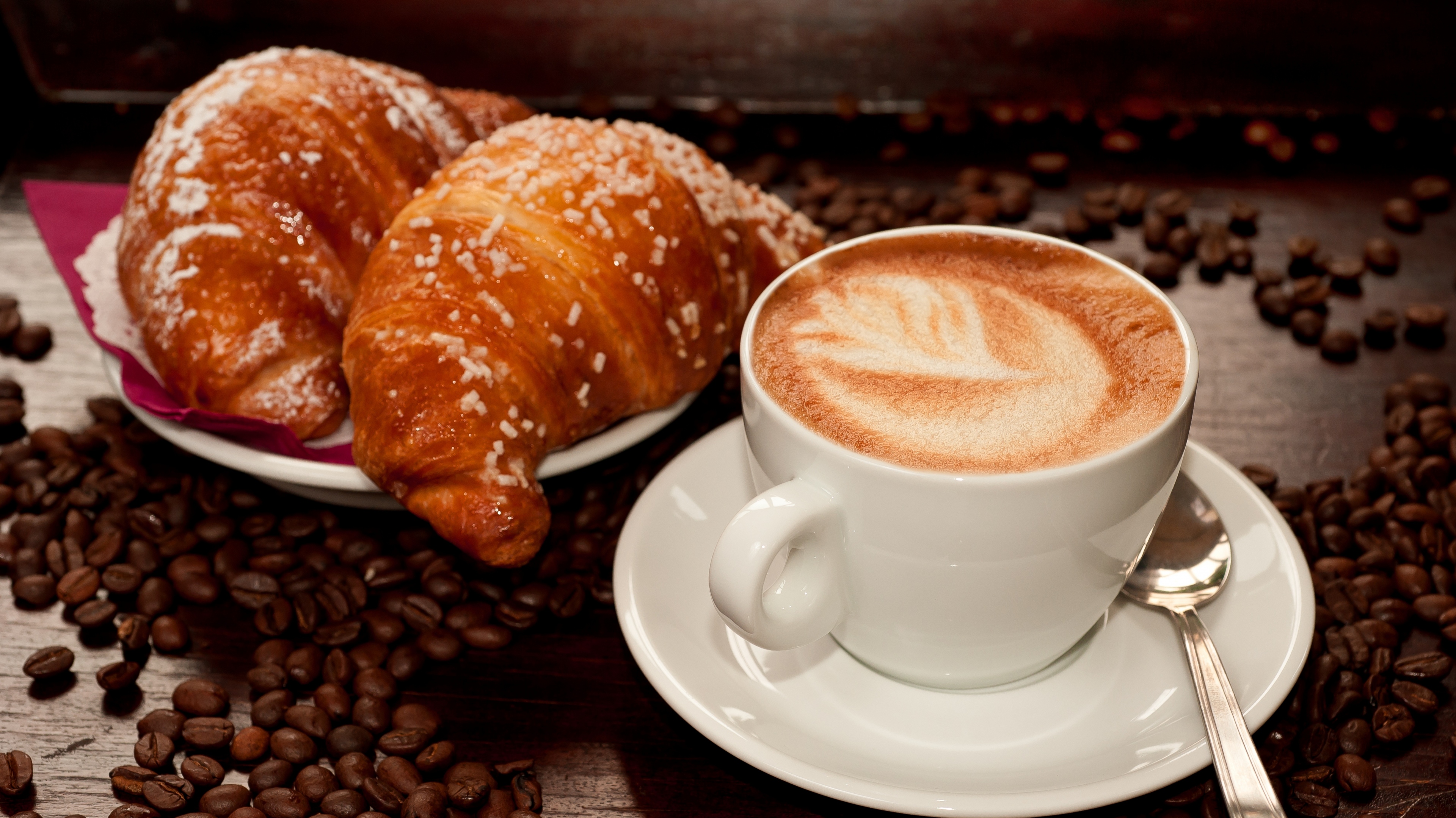 Coffee cappuccino croissant 4k wallpaper