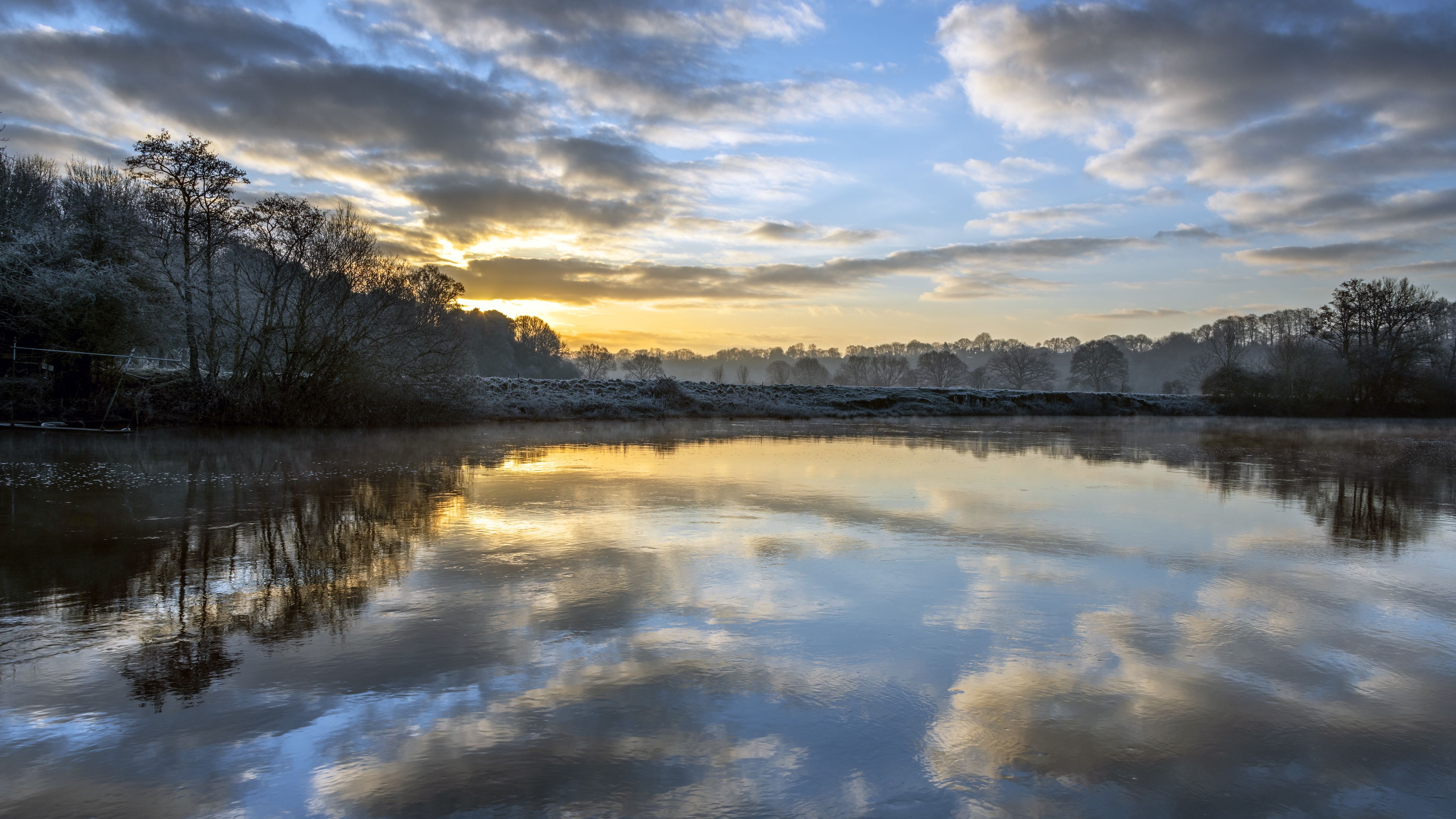 Dawn reflection trees 4k wallpaper
