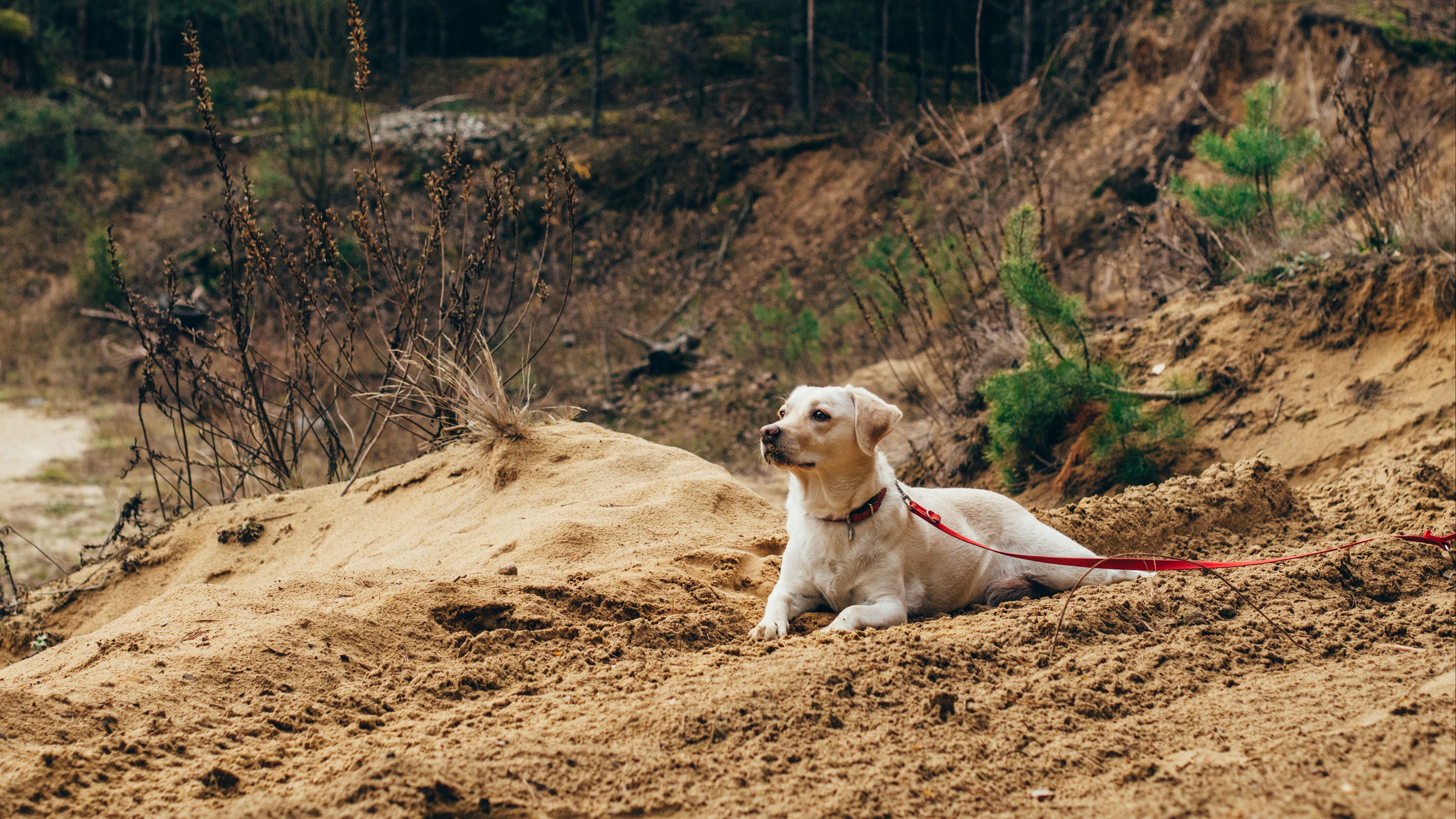 Dog sand leash walk 4k wallpaper