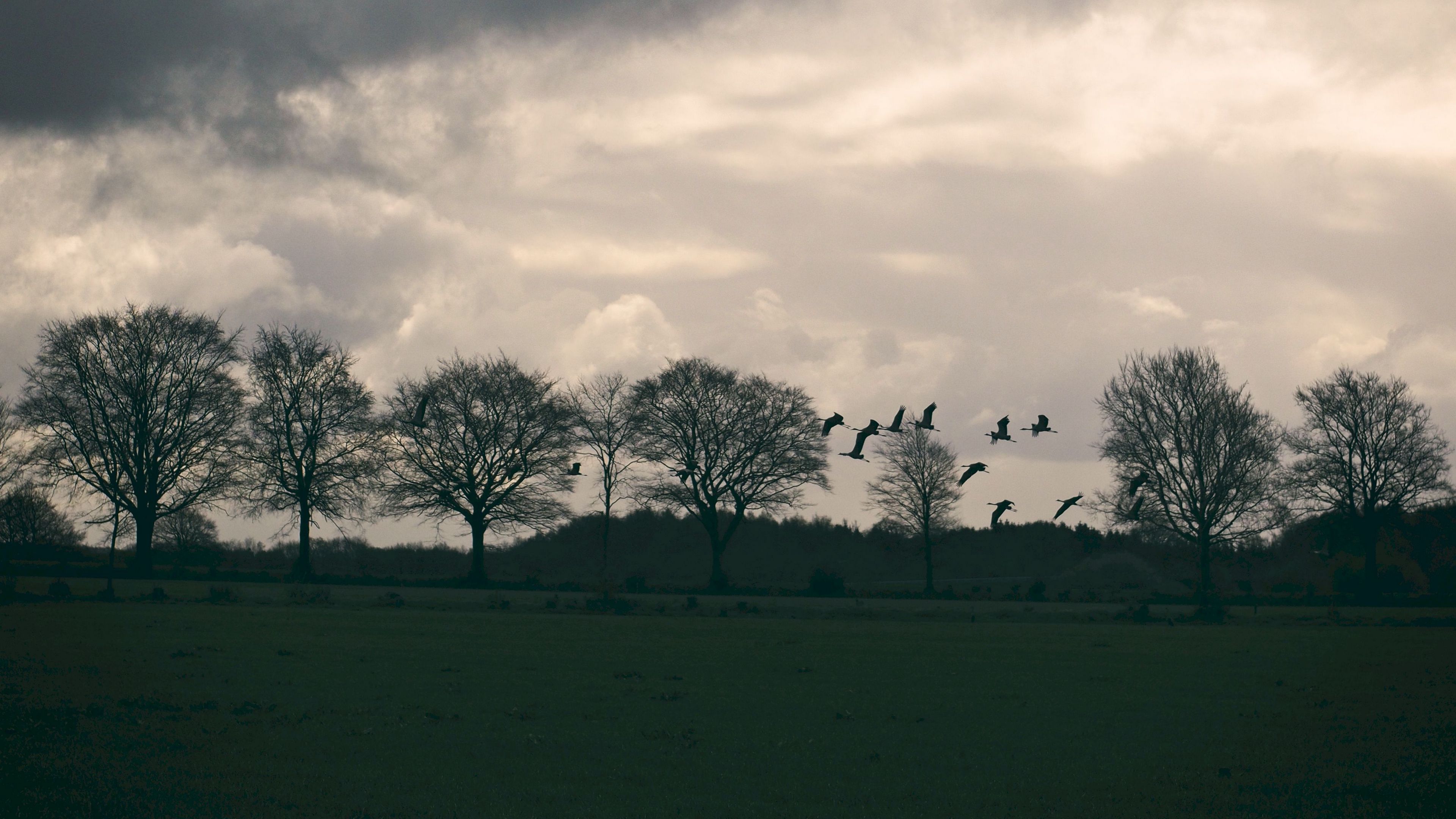 Field birds trees 4k wallpaper Description :