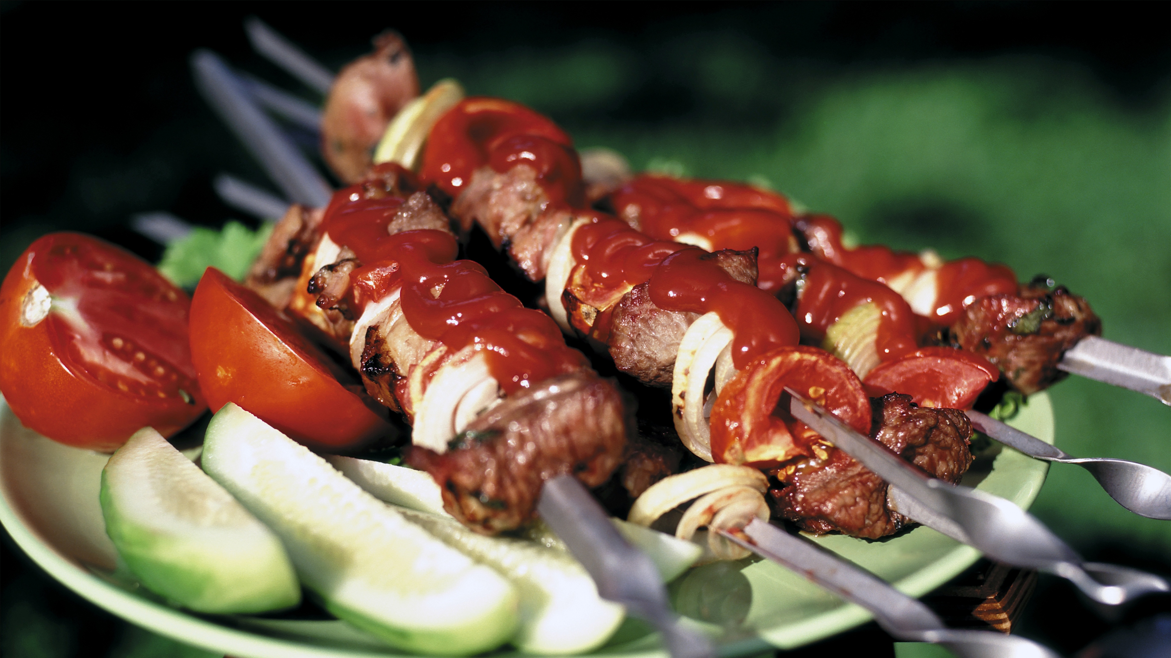 Food kebab meat tomato sauce vegetables cucumbers tomatoes skewers 4k wallpaper