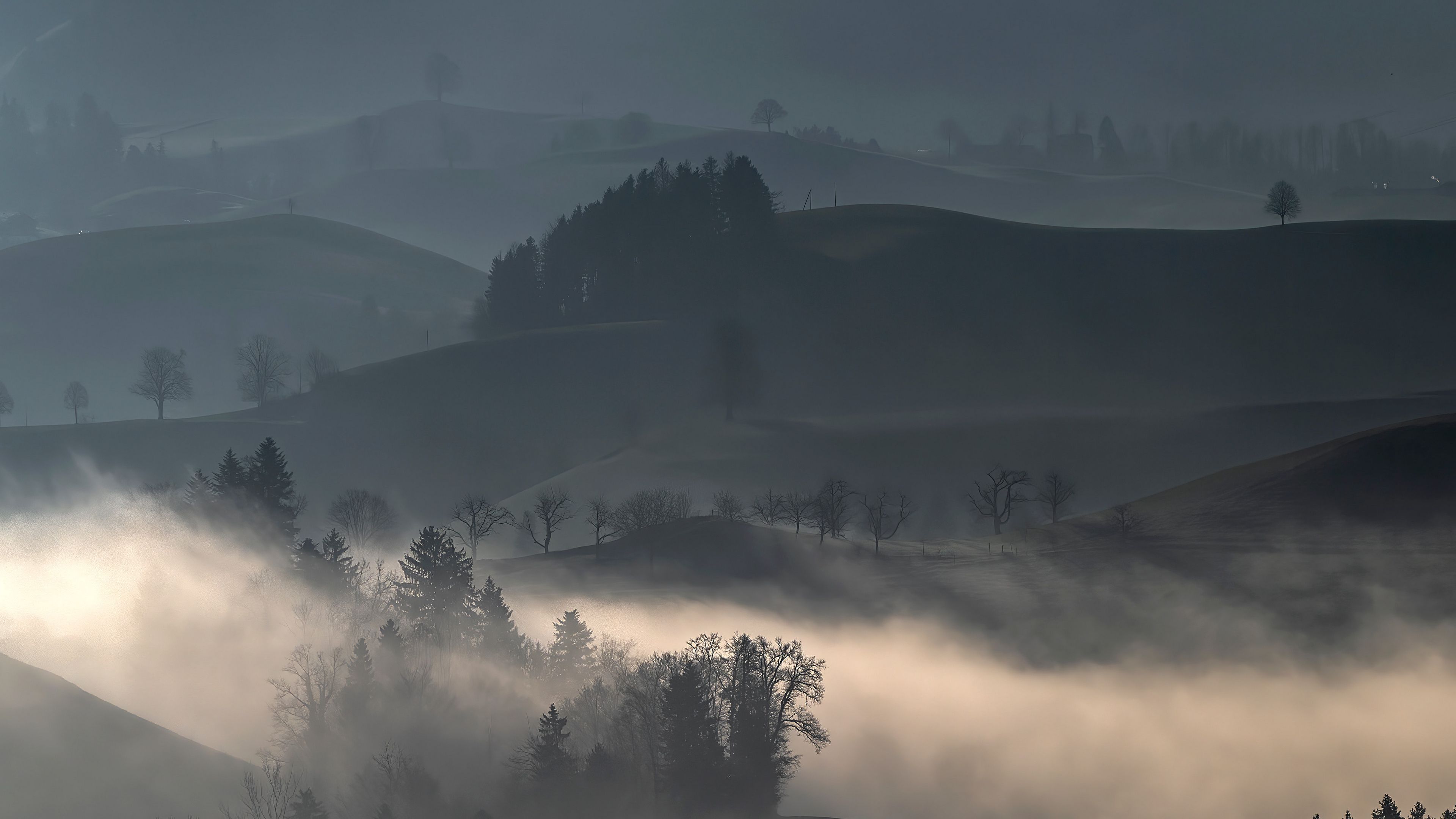 Hills fog trees image 4k wallpaper Description :