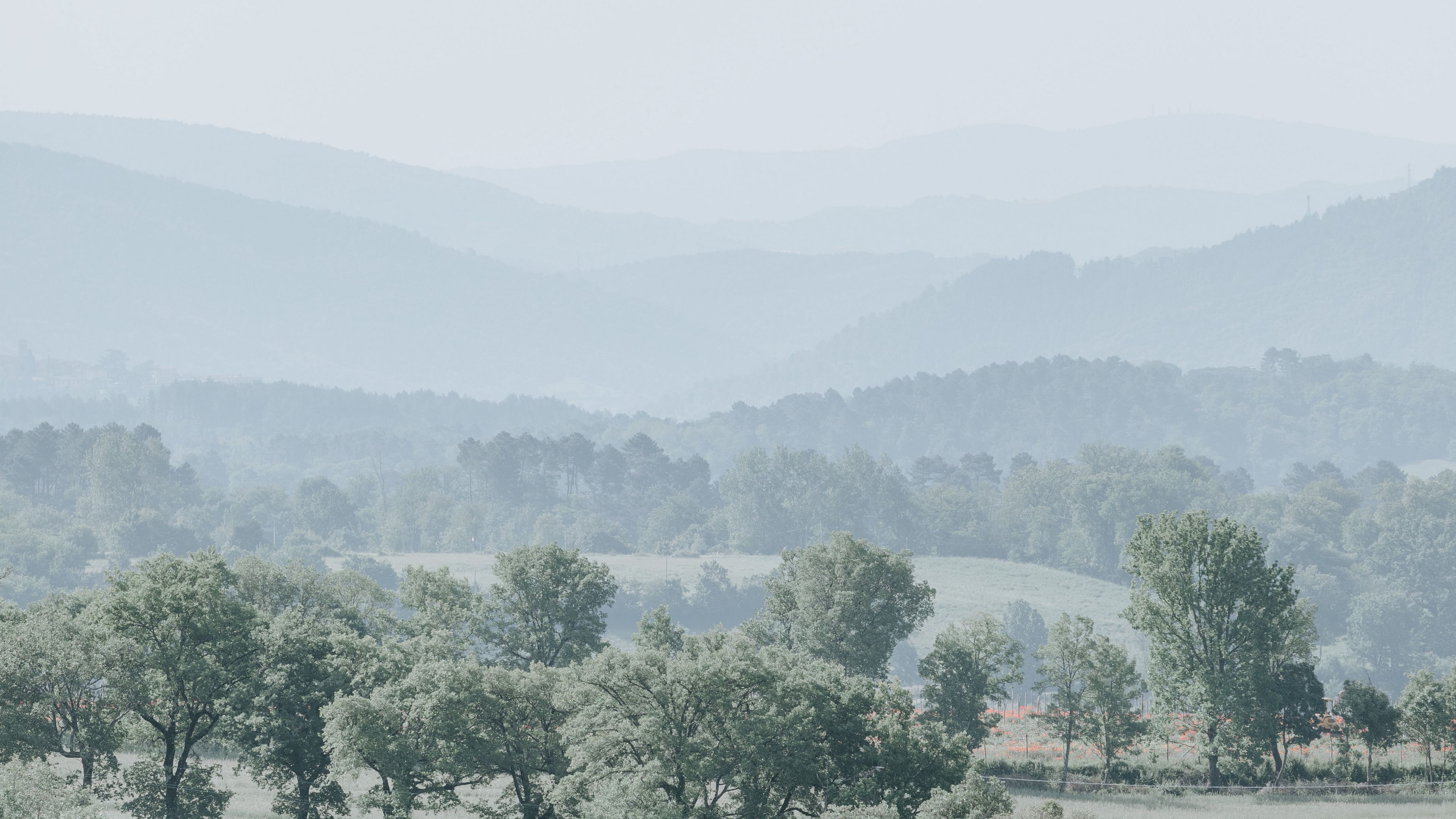 Hills trees fog 4k wallpaper