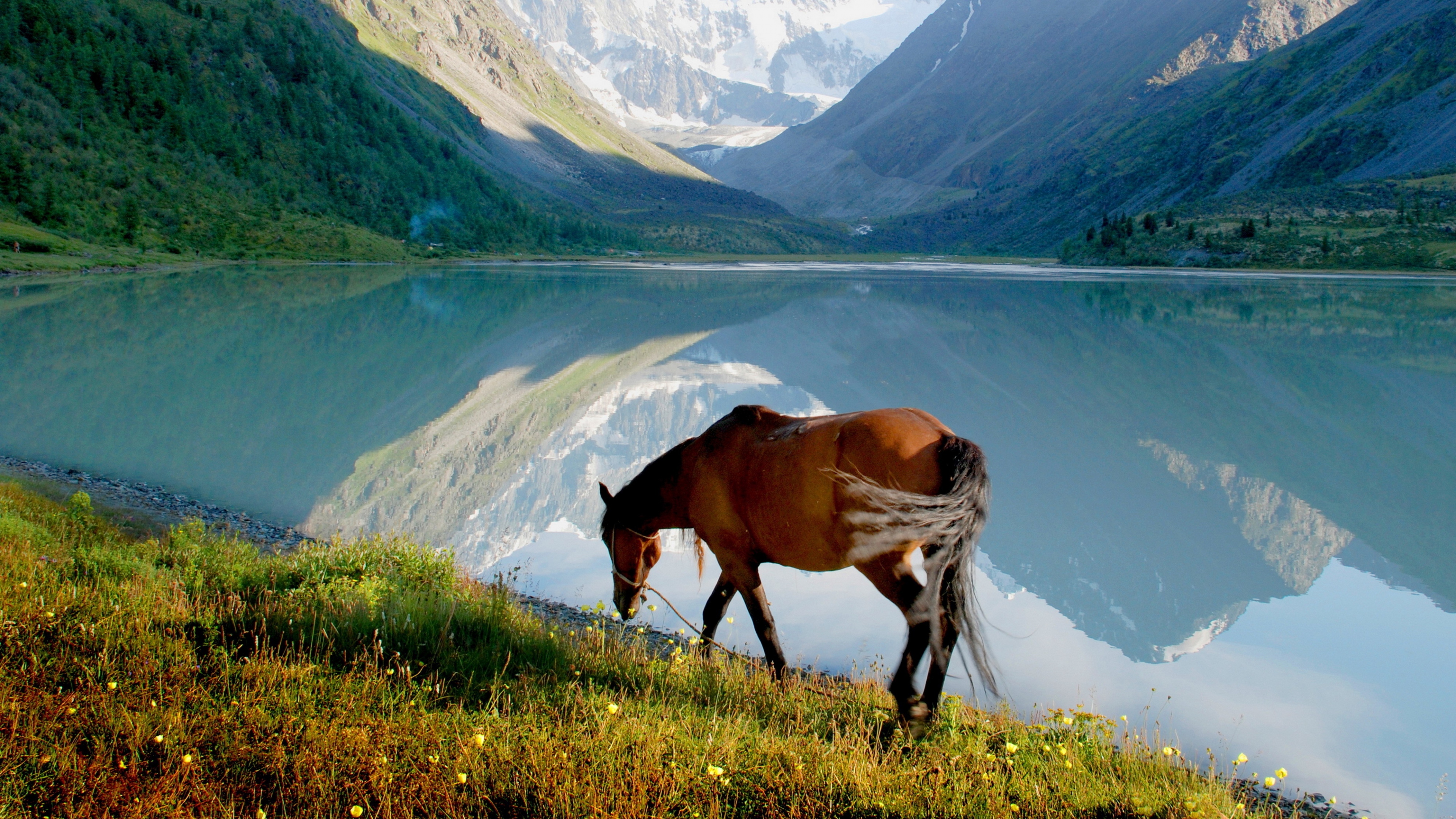 Horse mountain lake grass walk 4k wallpaper