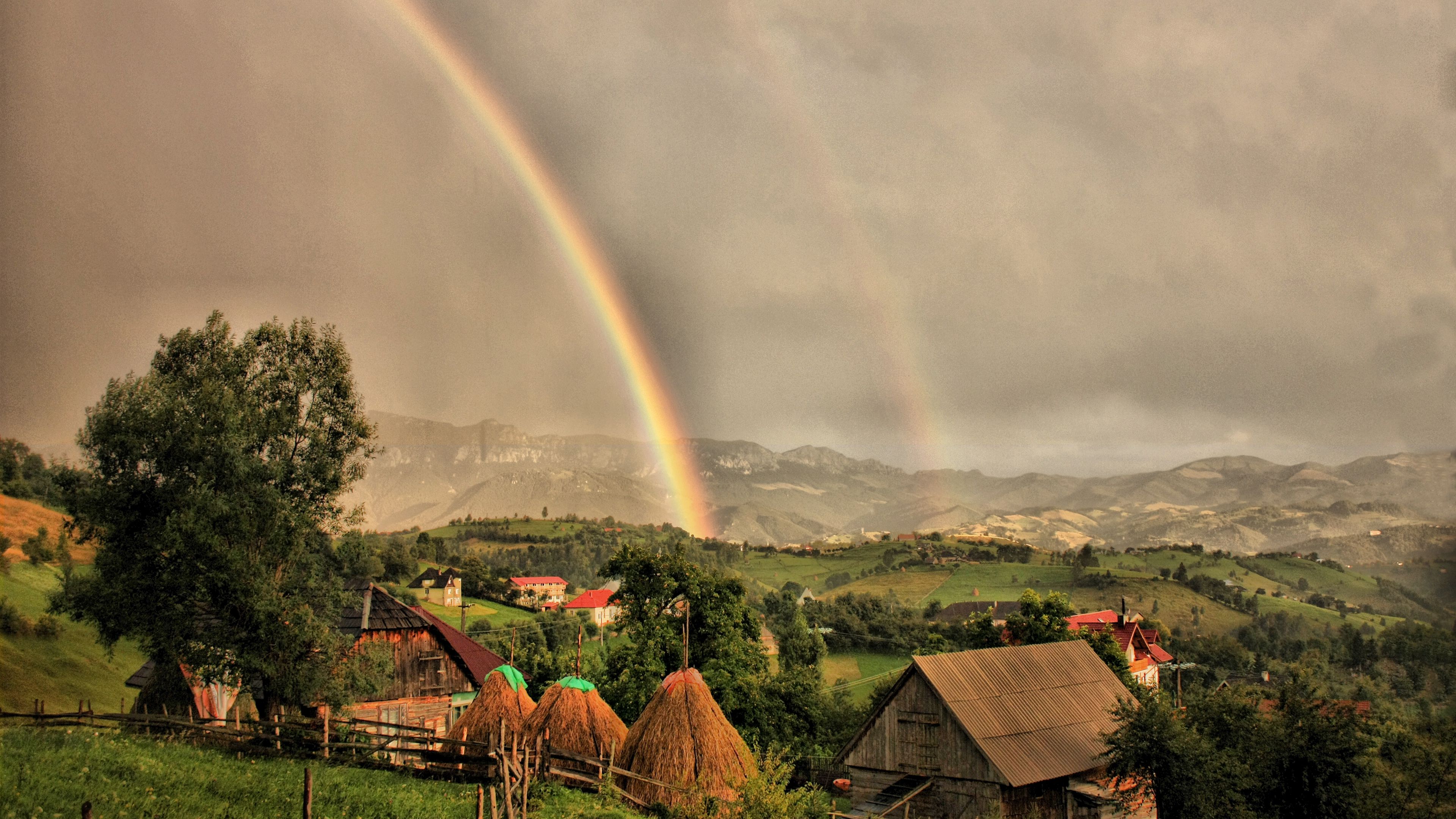 Houses clouds rainbow landscap 4k wallpaper Description :