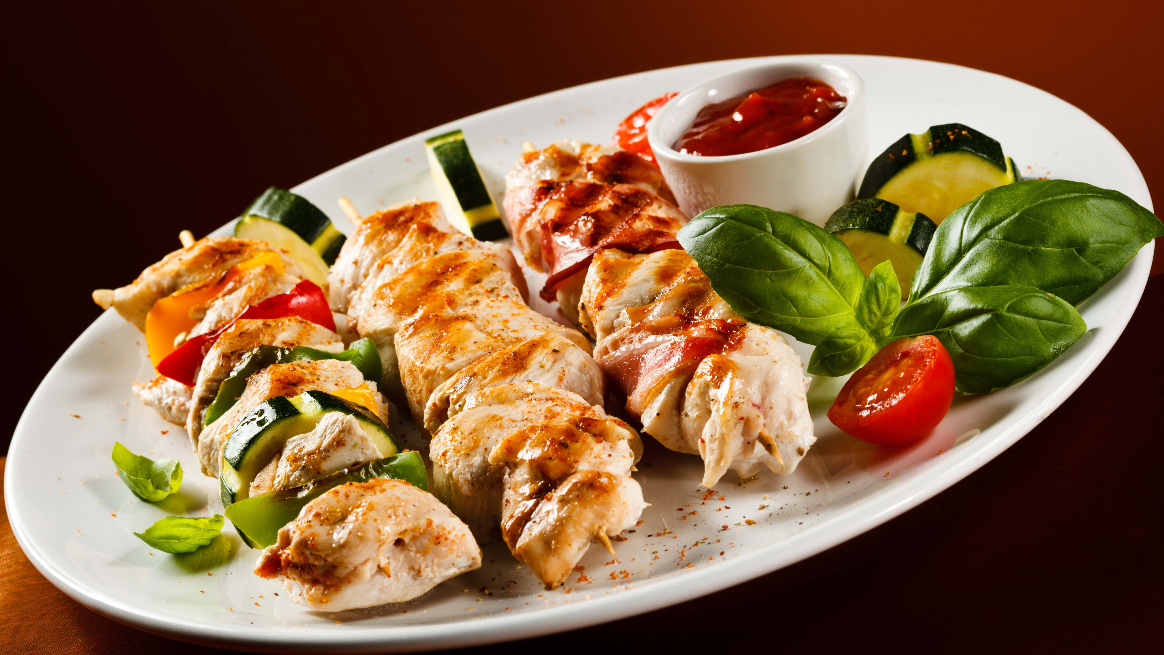Kebabs chicken leaves ketchup 4k wallpaper