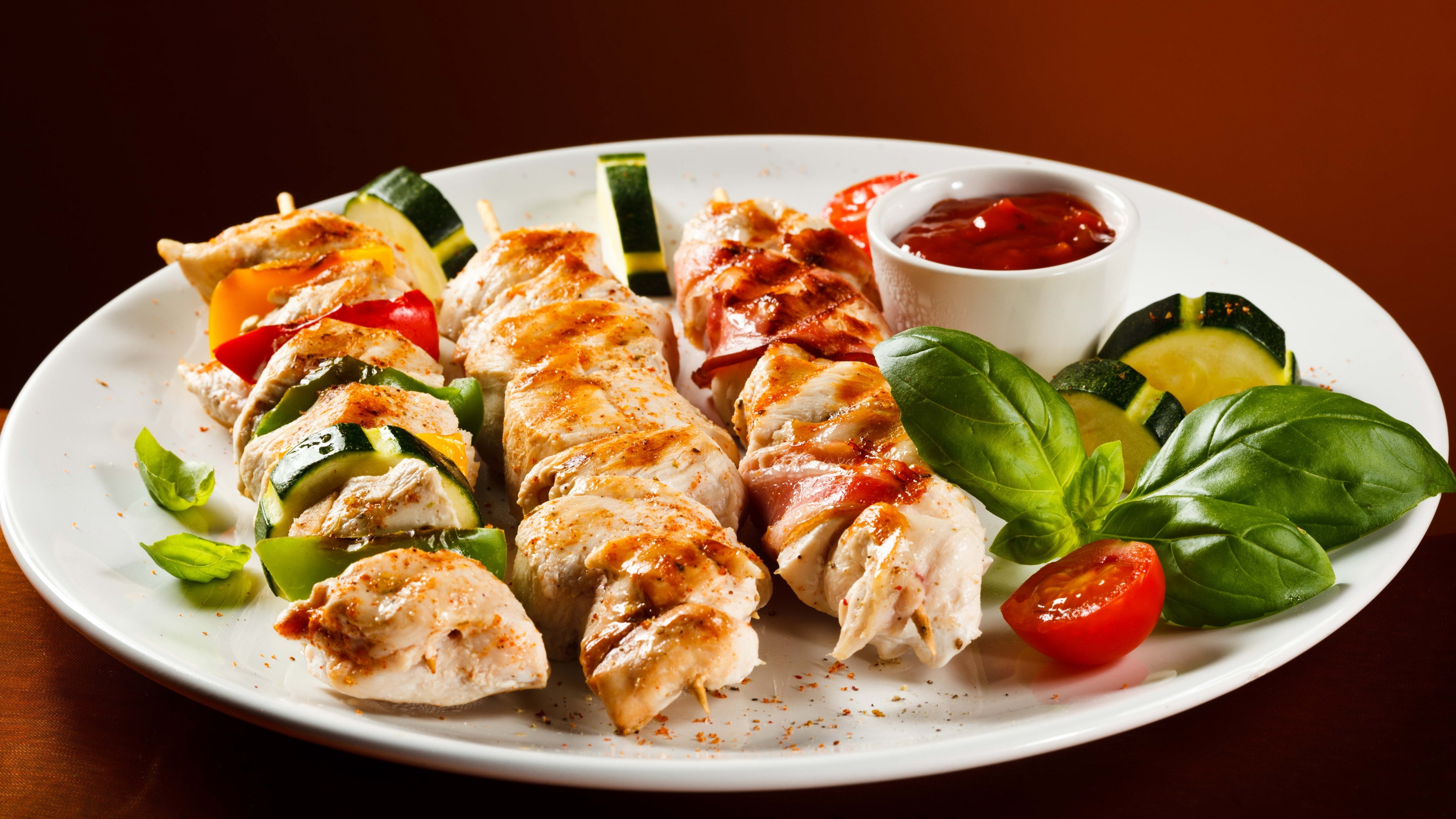 Kebabs chicken plates ketchup dish 4k wallpaper Description :