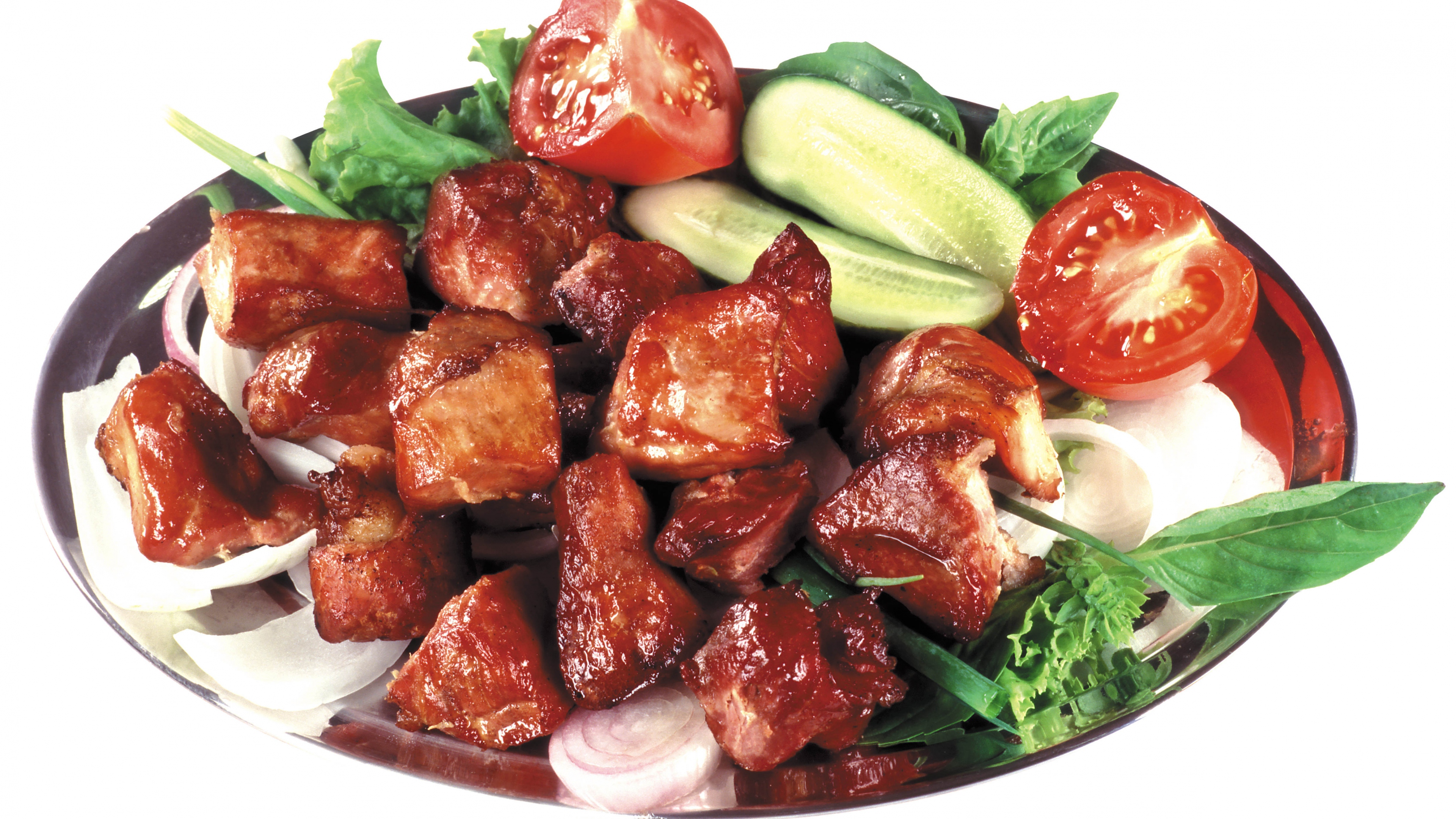 Kebabs meat vegetables cucumbers tomatoes onions plate white background green 4k wallpaper Description :