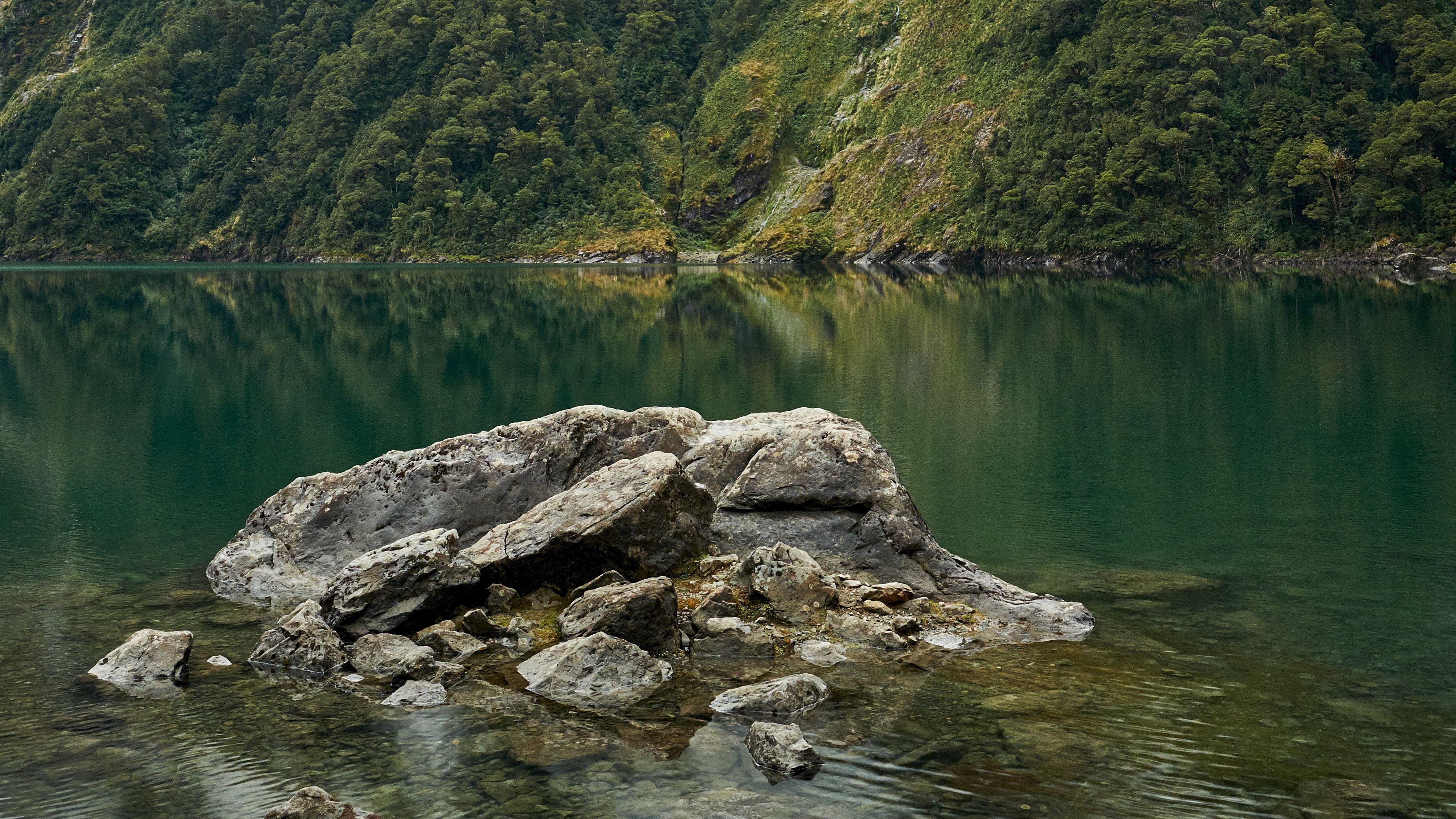 Lake fog rocks 4k wallpaper Description :