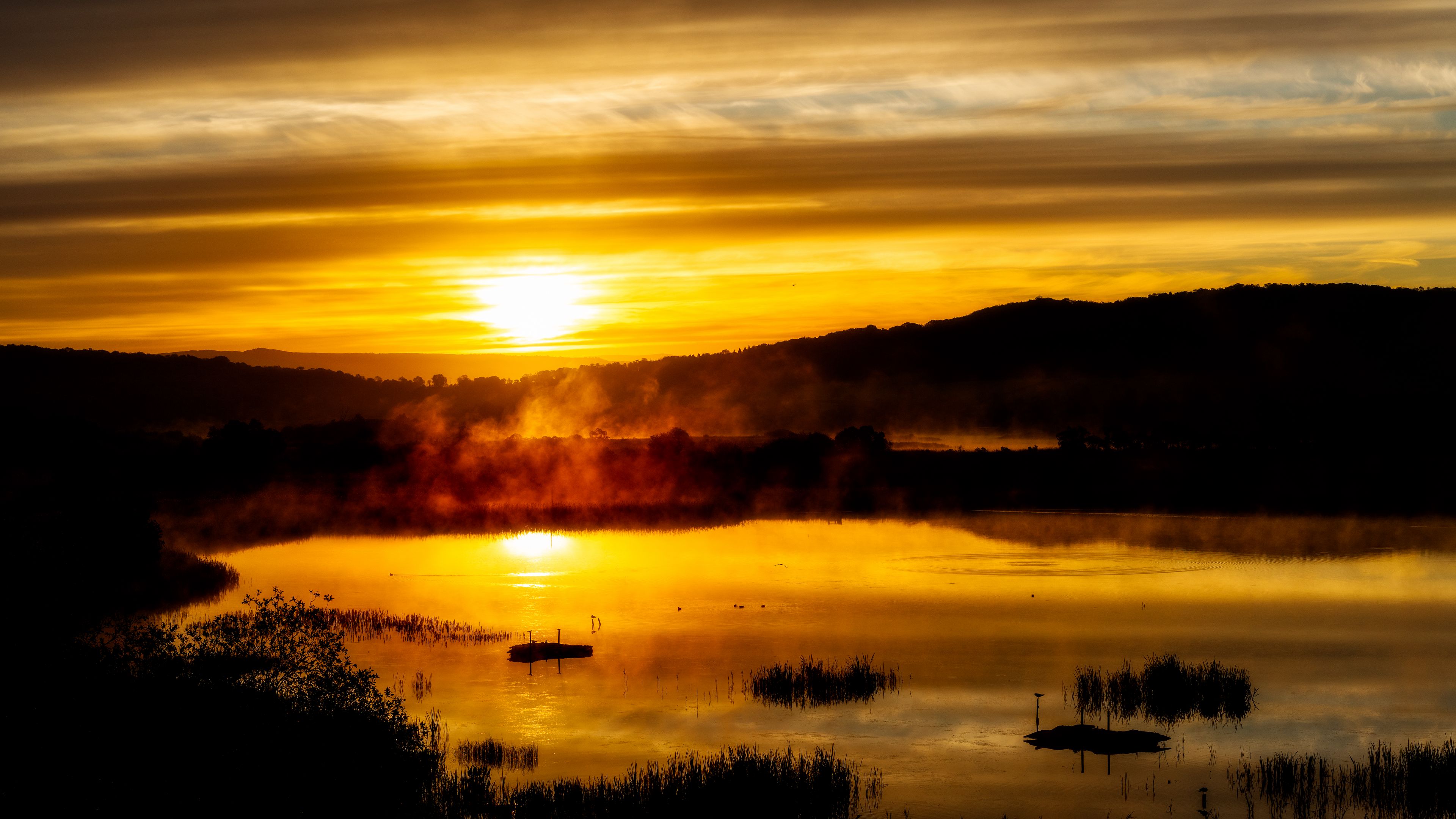 Lake sunset fog 4k wallpaper
