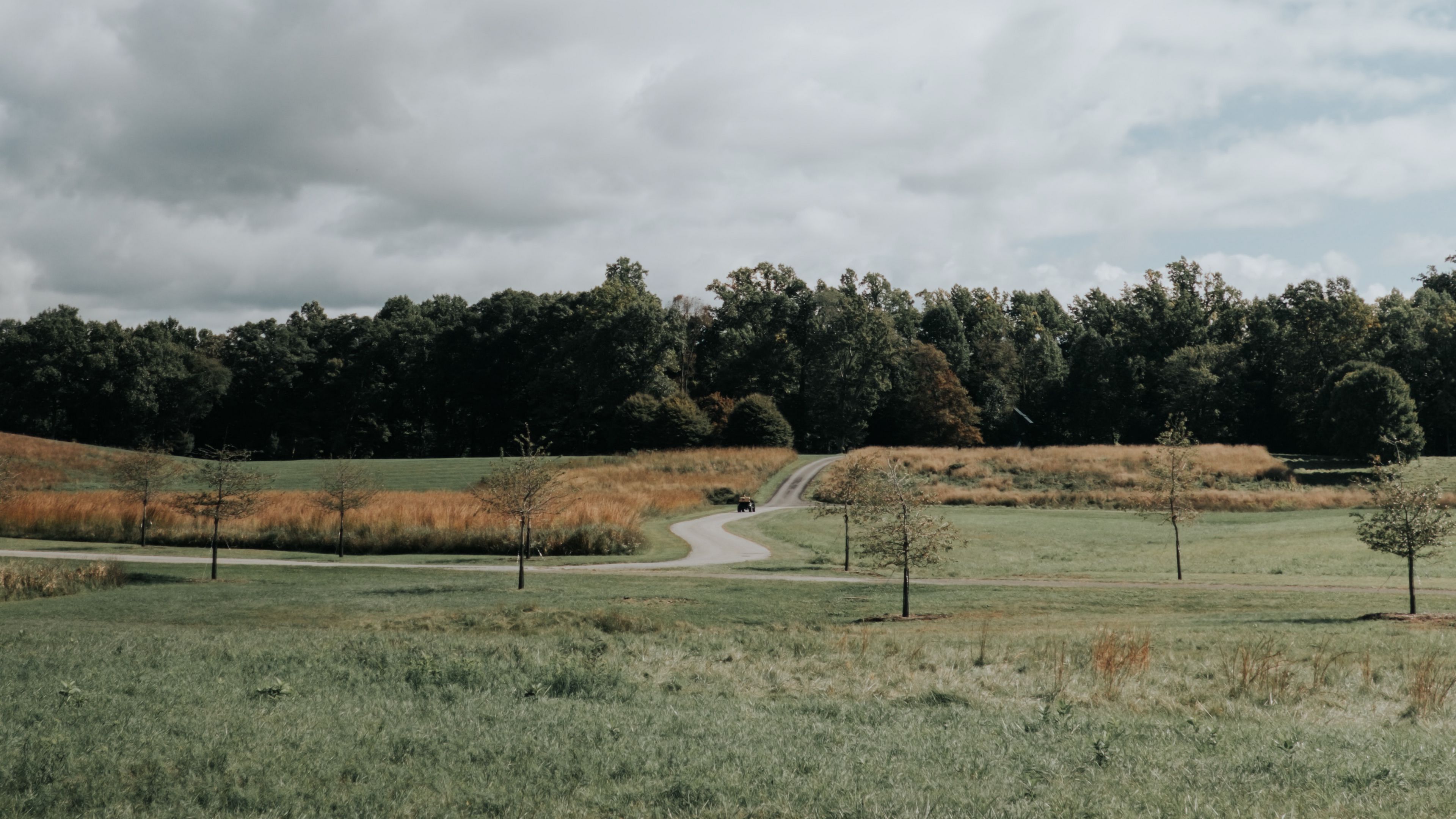 Lawn trees road 4k wallpaper
