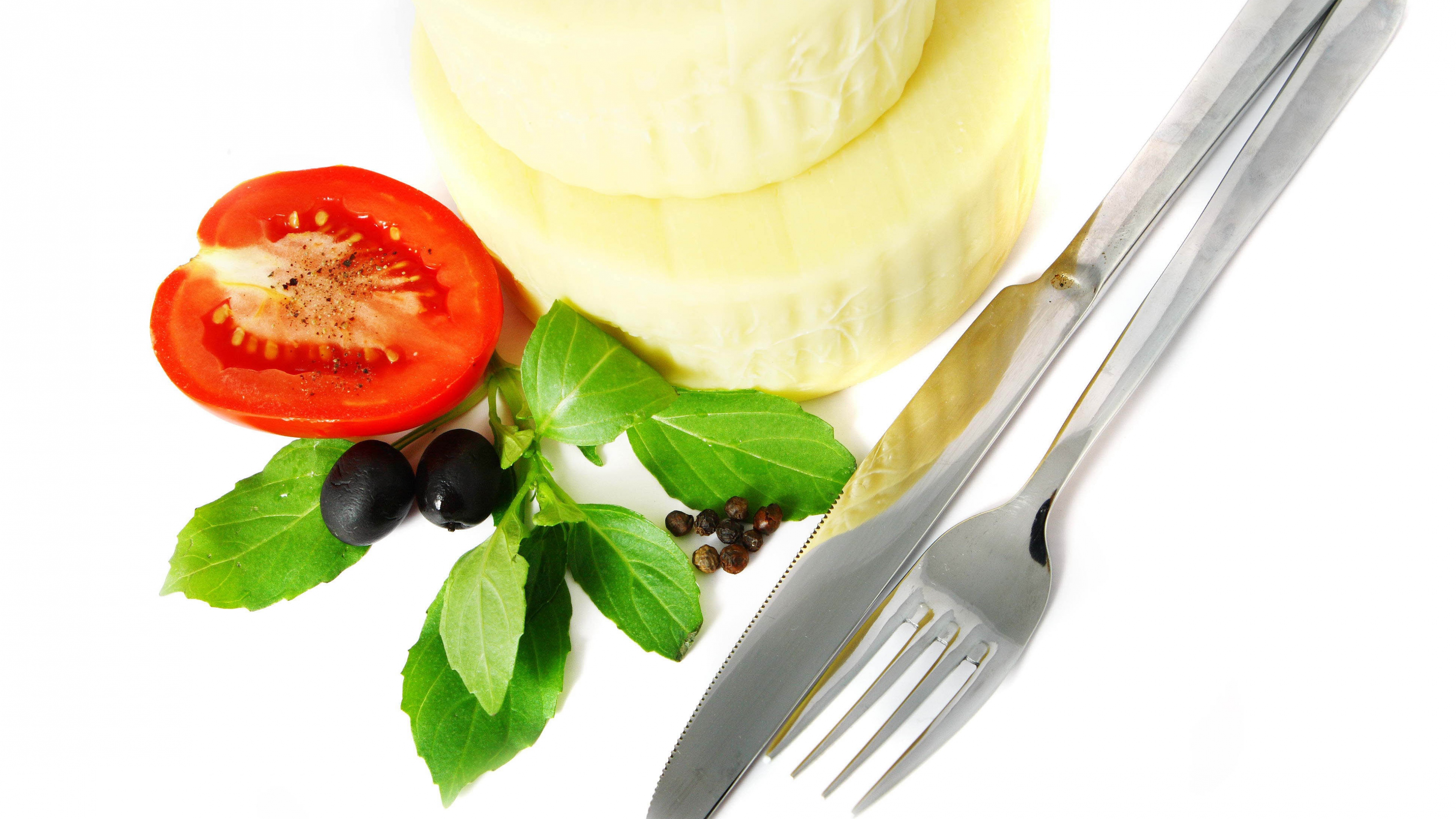 Oil fork knife tomato white background olives leaves 4k wallpaper Description :