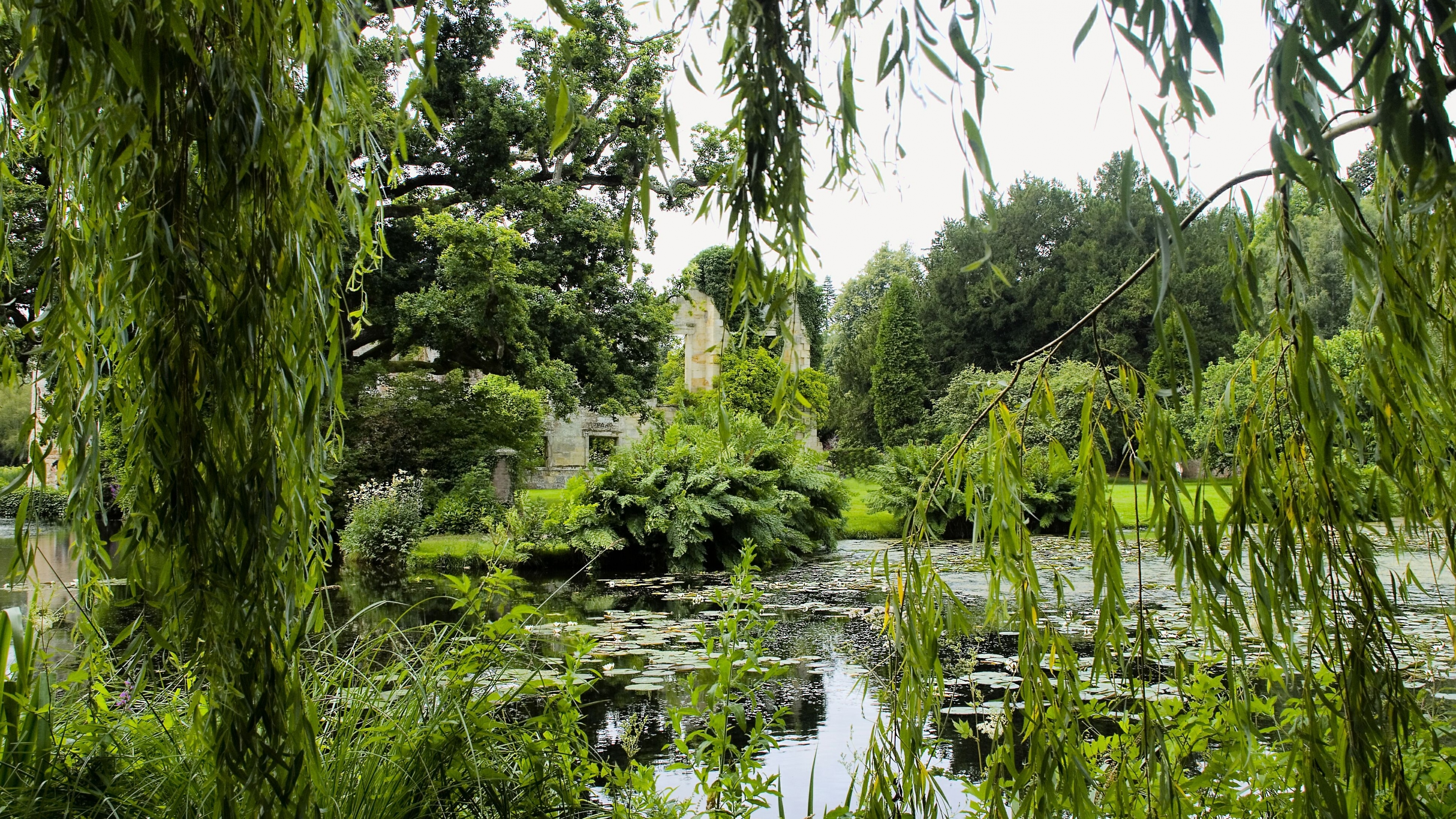 Park pond trees branches landscape 4k wallpaper