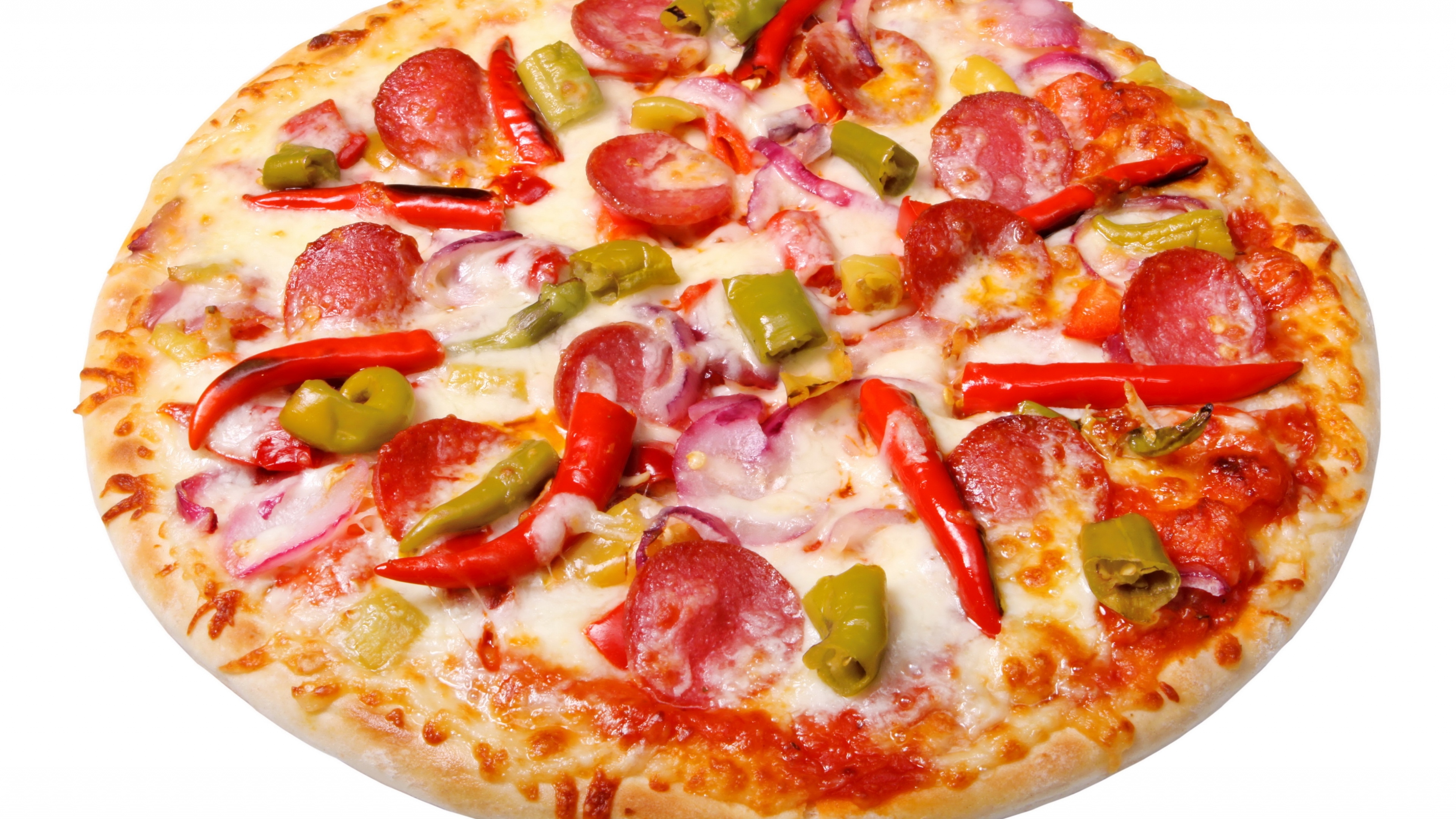 Pizza cheese sausage vegetables baked 4k wallpaper