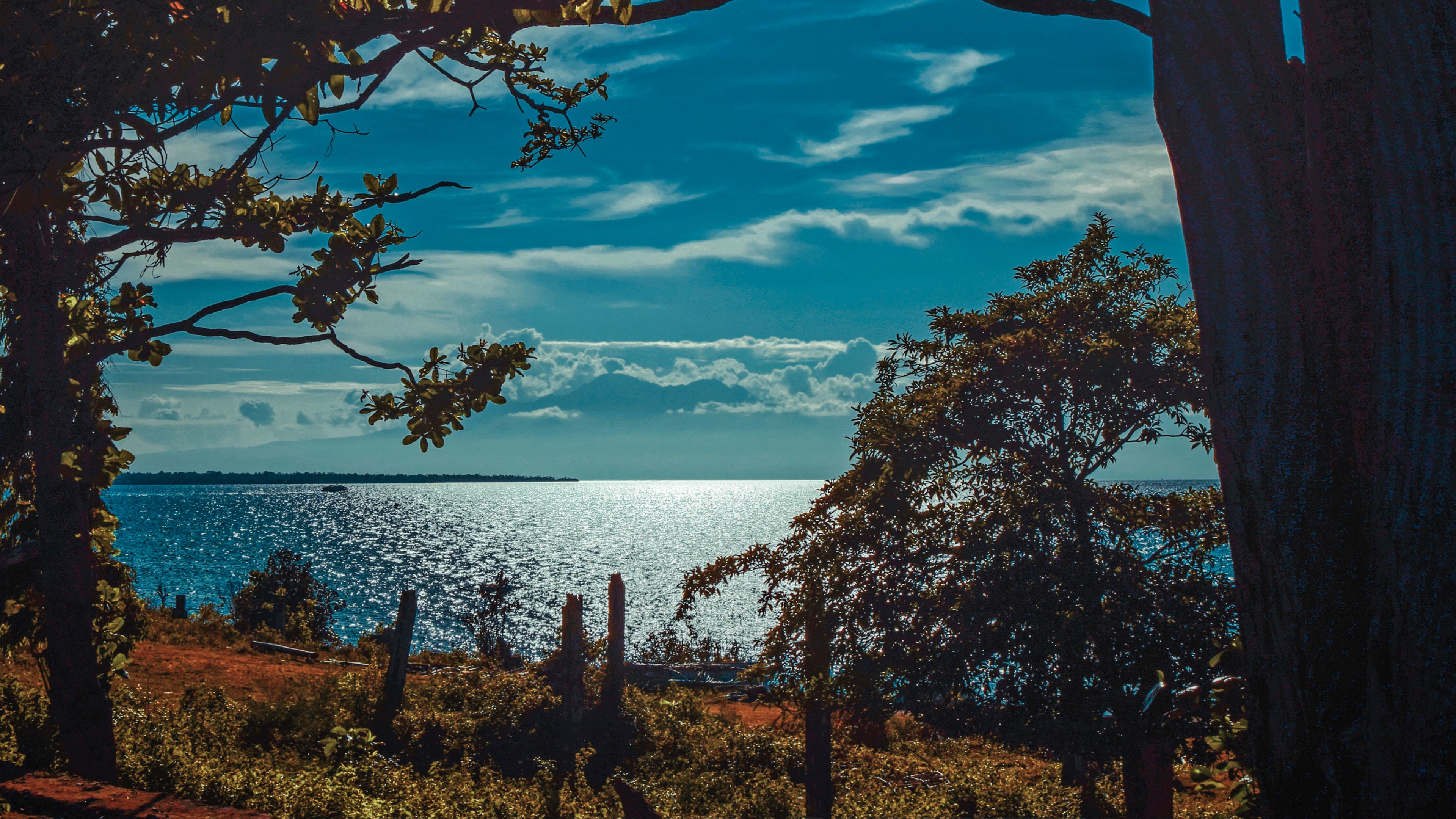 River shore trees sunlight 4k wallpaper Description :