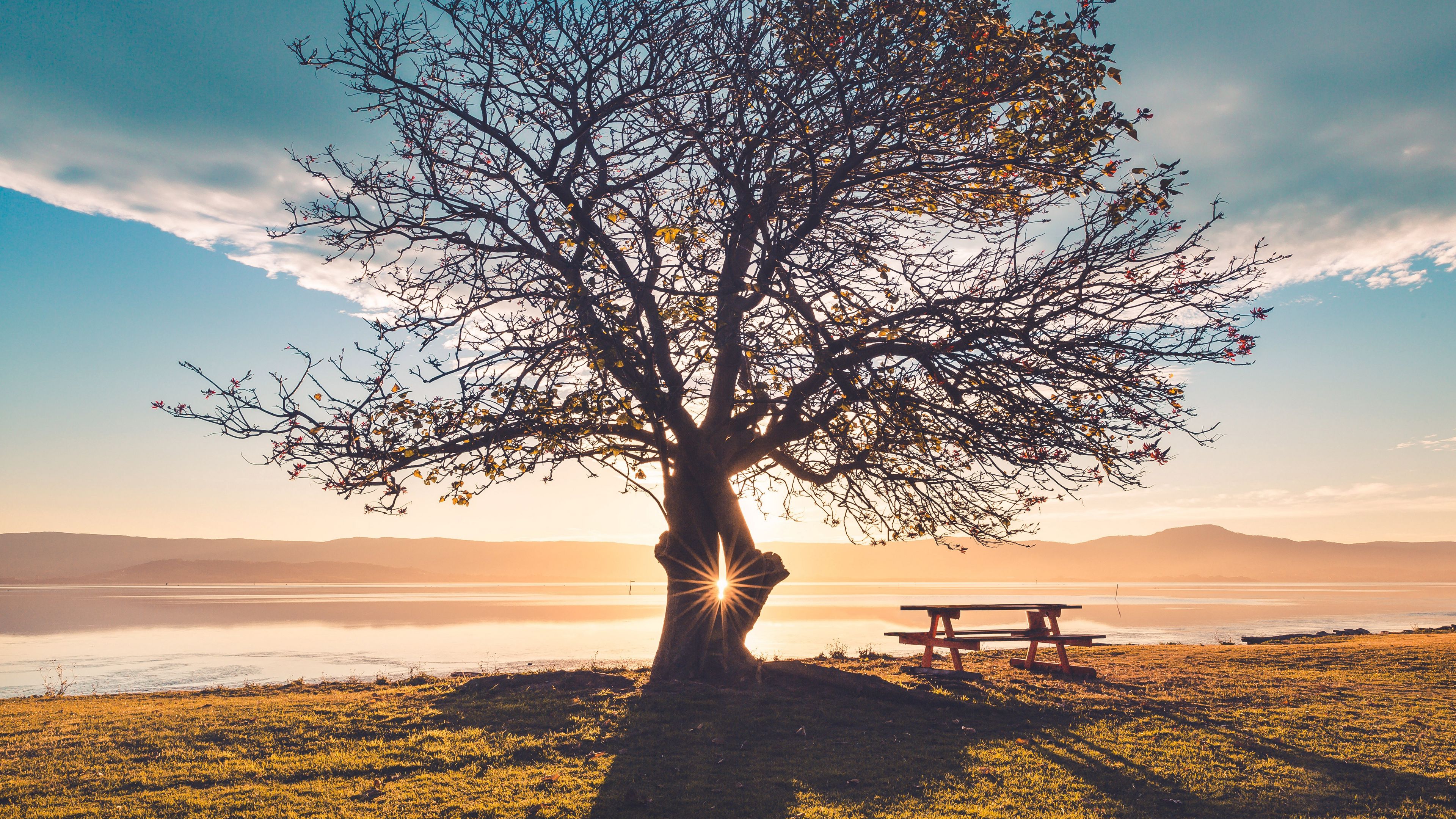 Tree bench table light 4k wallpaper