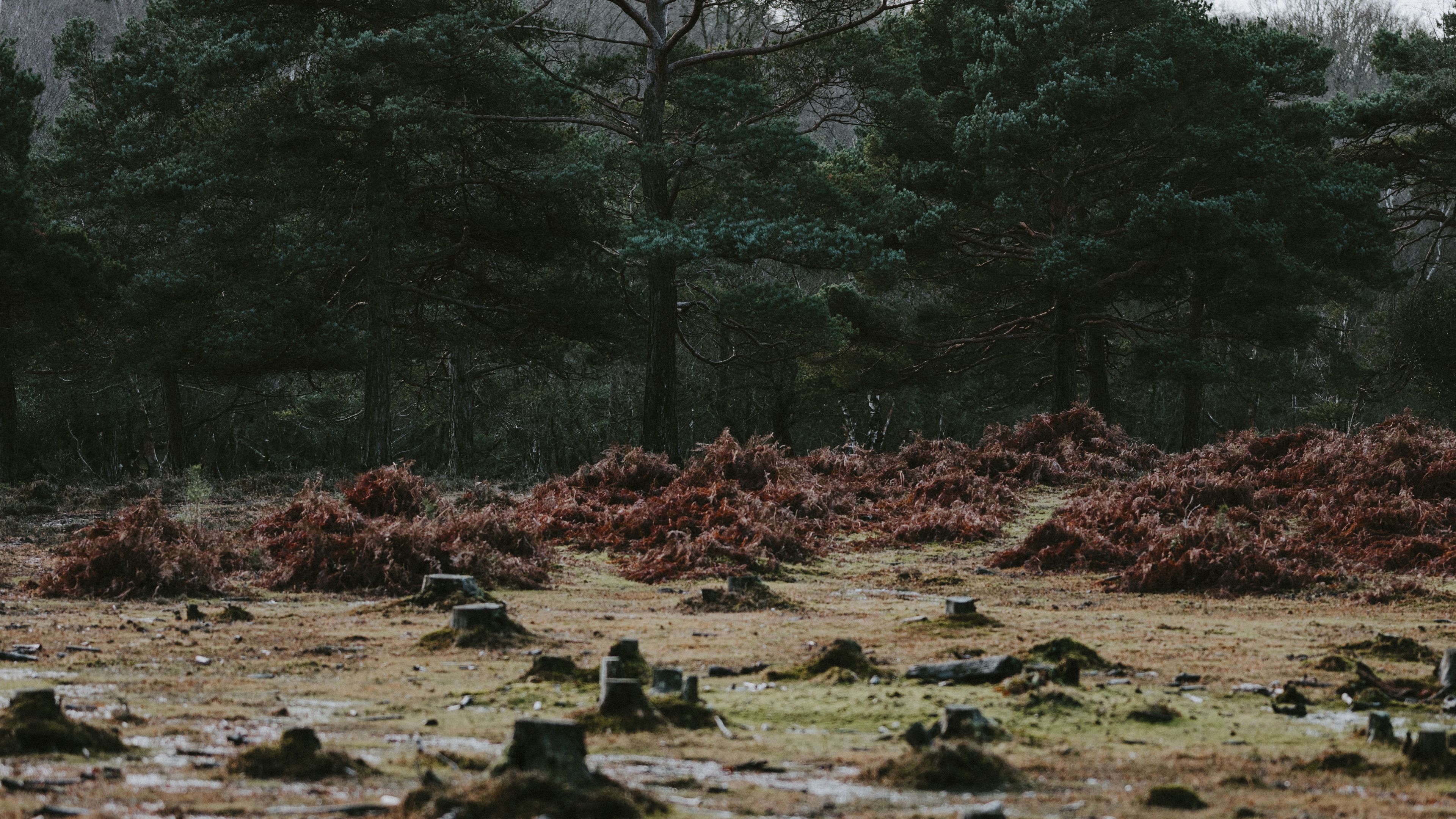 Trees stumps puddles 4k wallpaper Description :