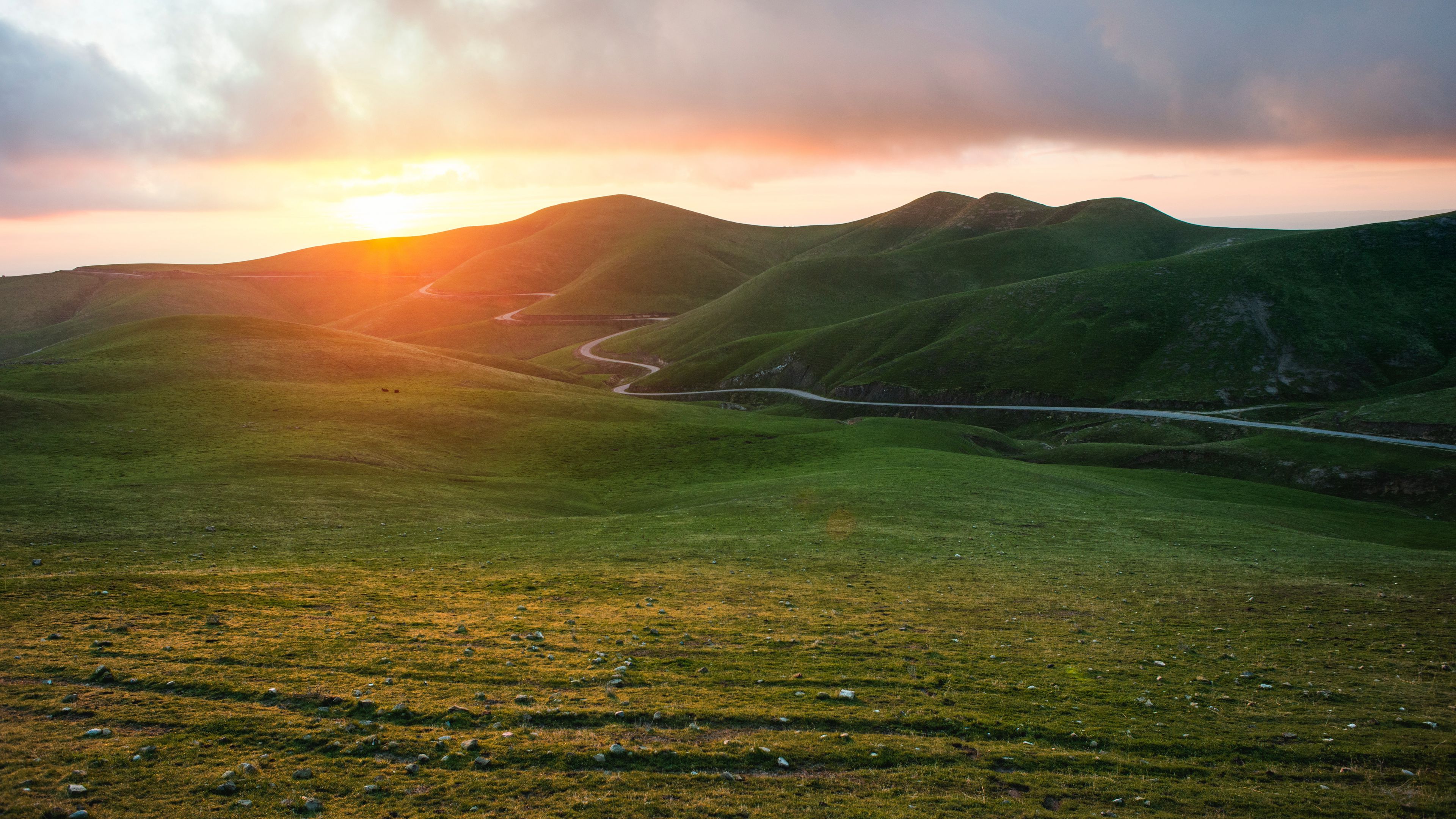 Valley grass sunset path 4k wallpaper