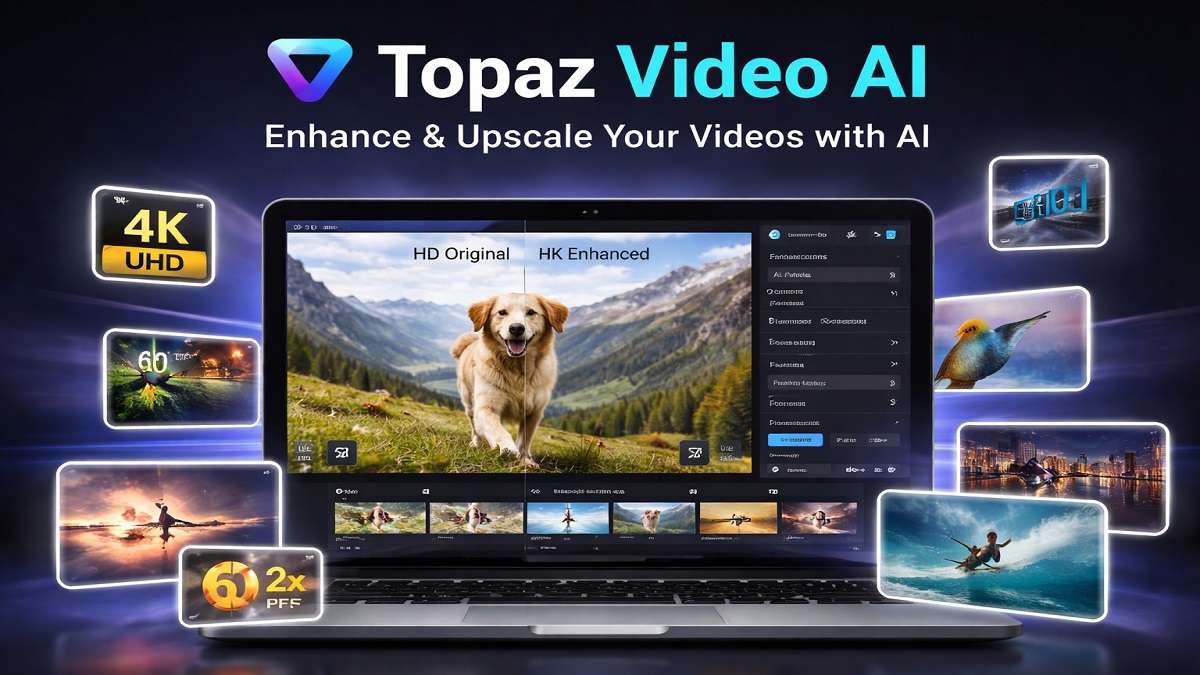 Topaz Video AI is one of the most powerful AI video enhancement tools available today. The software uses advanced machine learning models to upscale video resolution, restore old footage, increase frame rates, and improve overall video clarity.