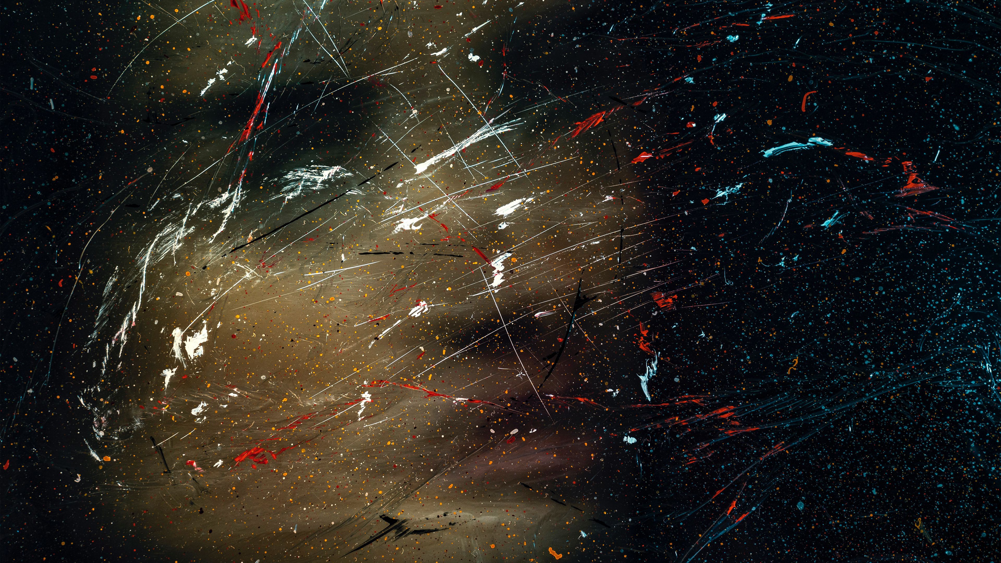 Throughout the wallpaper, scattered paint splatters form irregular droplets and abstract stains that appear dynamic and energetic. These splashes add texture and movement to the scene, giving the design a sense of creative freedom. Behind the splatters, blurred color layers soften the overall appearance and produce a dreamy visual atmosphere.