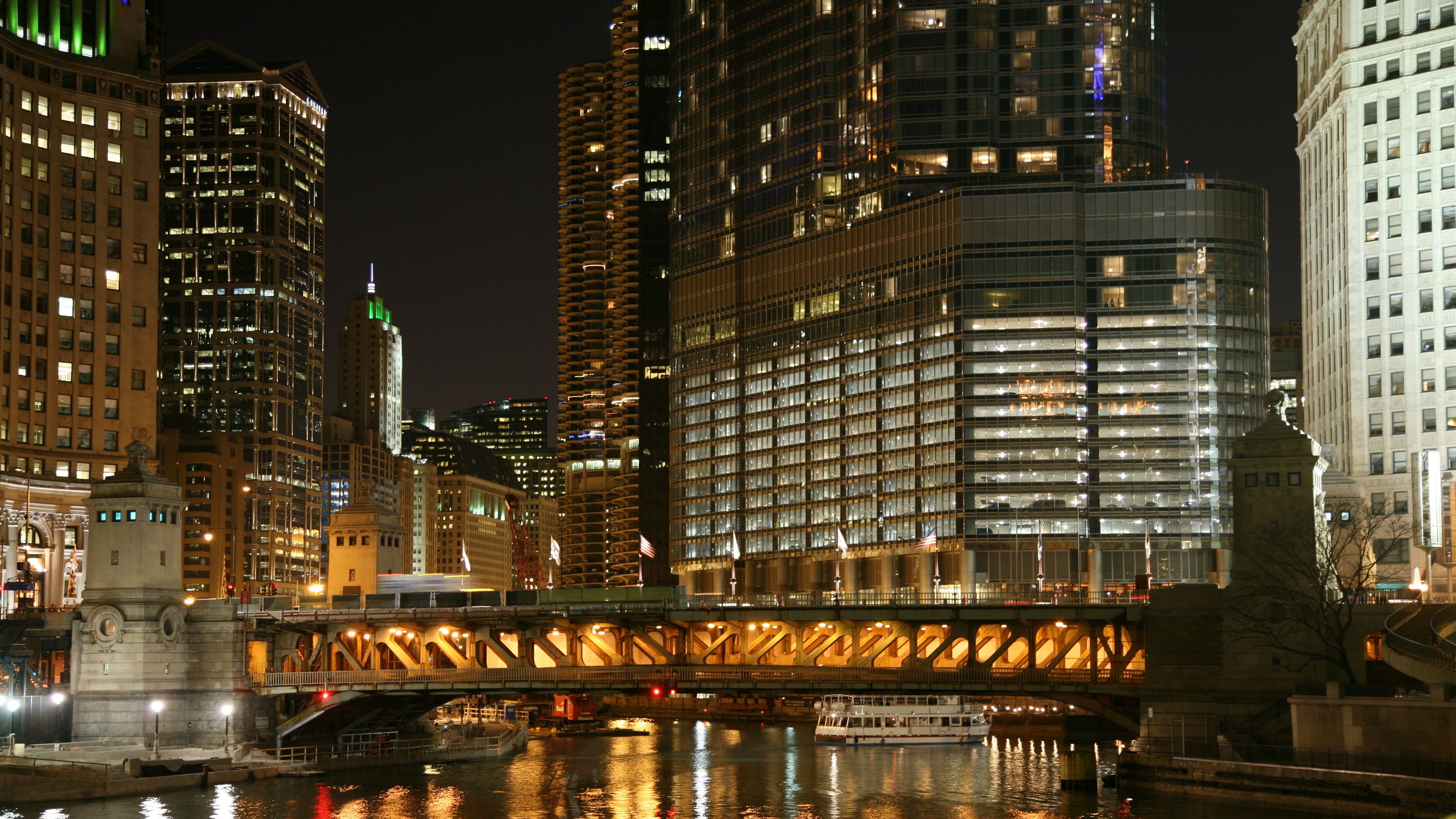 Explore skyscrapers reflections bridge wallpaper in 4K HD. Stunning cityscape with mirrored buildings and urban night lights.