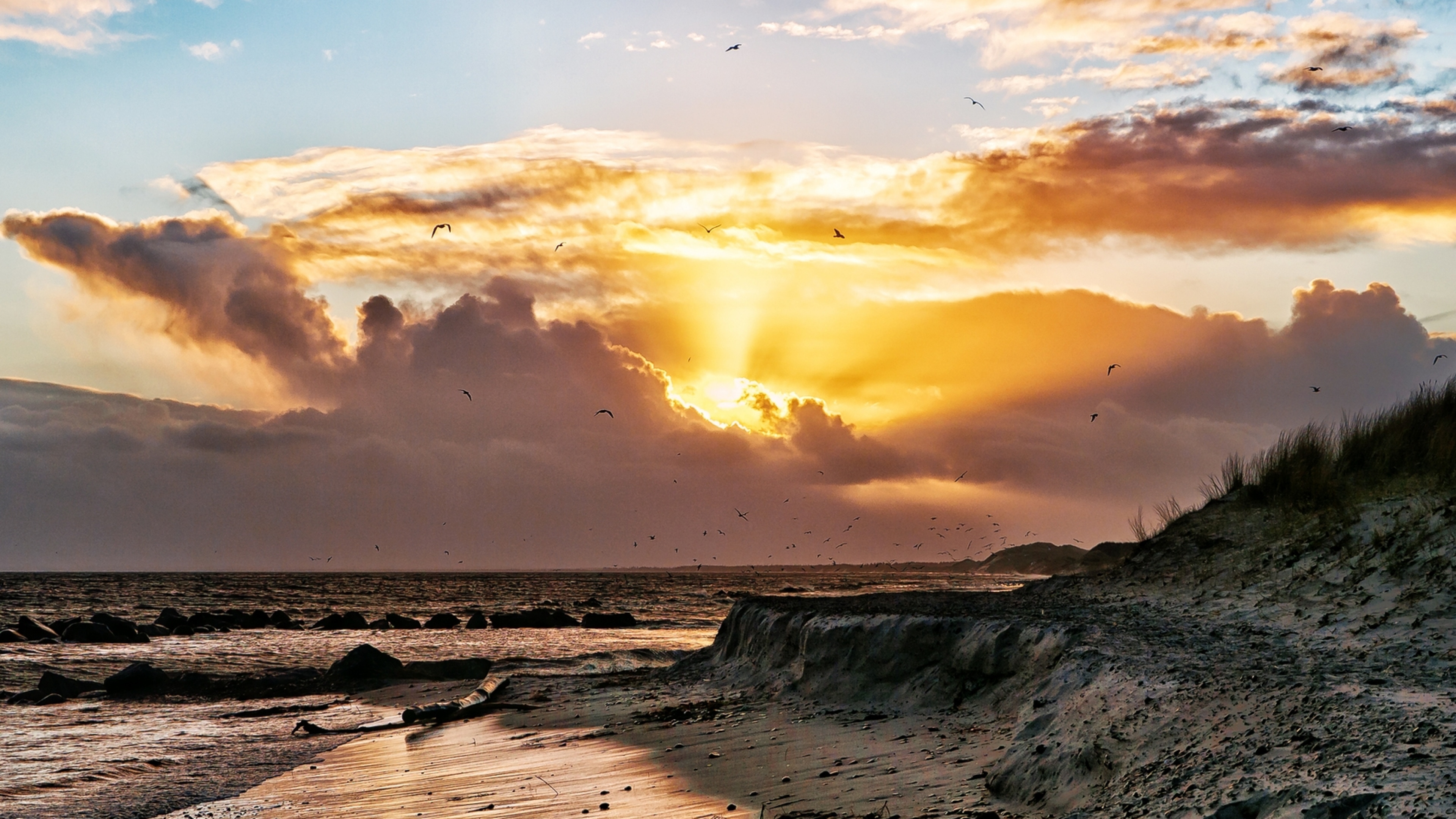 sea coast seagulls birds decline clouds 4k wallpaper Description :