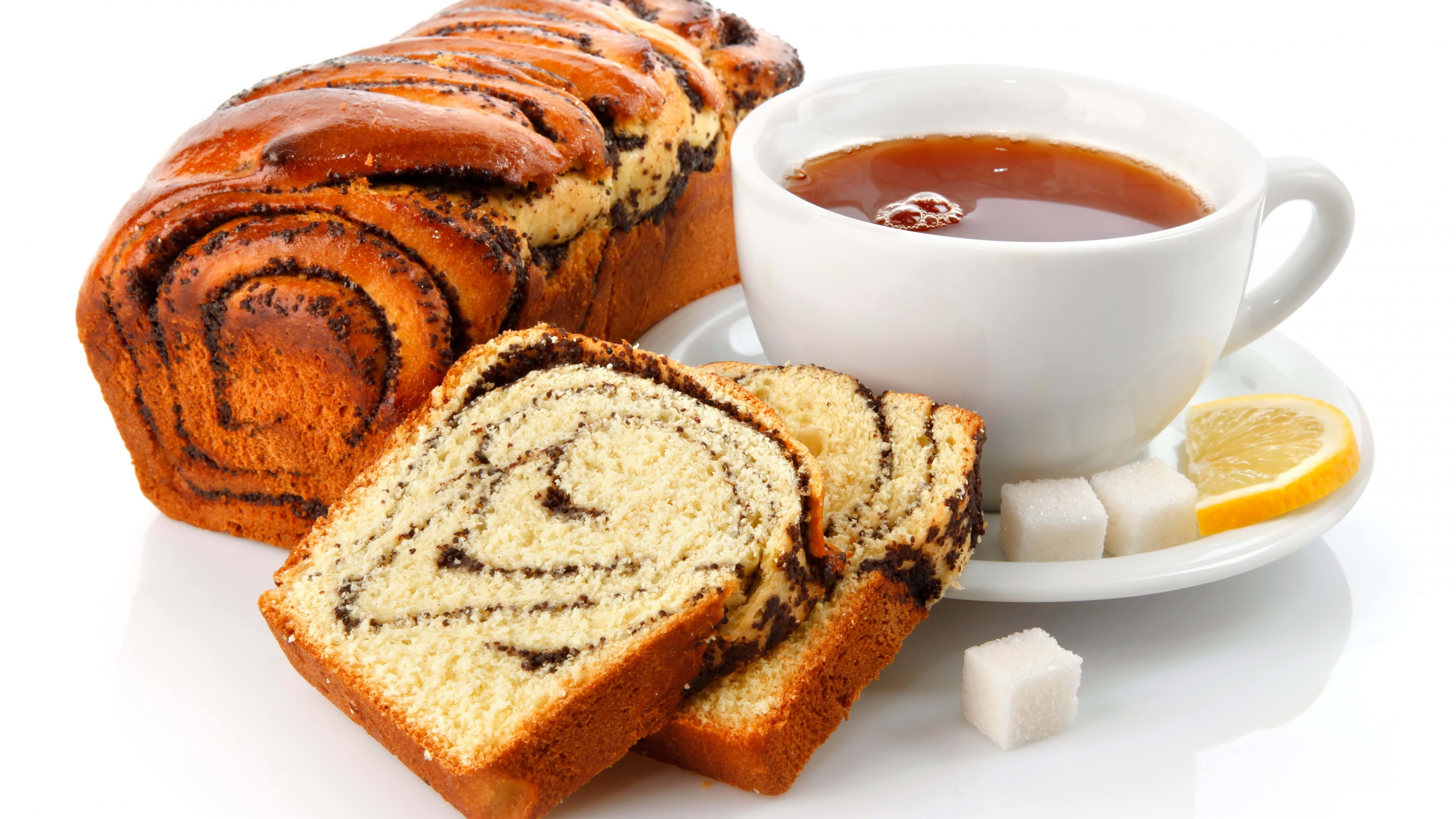 Tea Cup Bread Poppy Breakfast Sugar Lemon White Background HD & 4K Wallpaper (3840x2160)