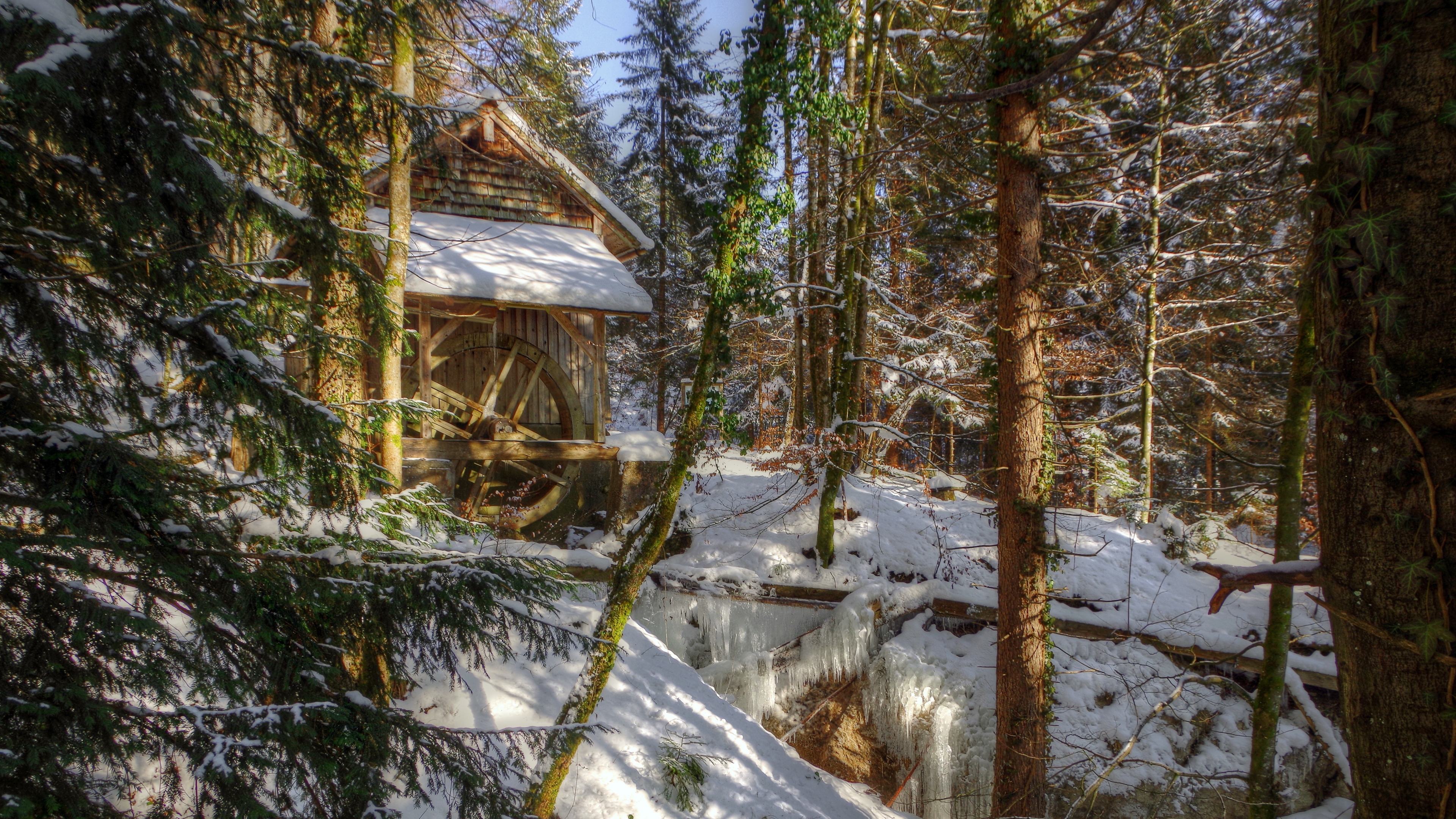 Winter Forest River Mill Landscape Wallpaper - HD & 4K Backgrounds: