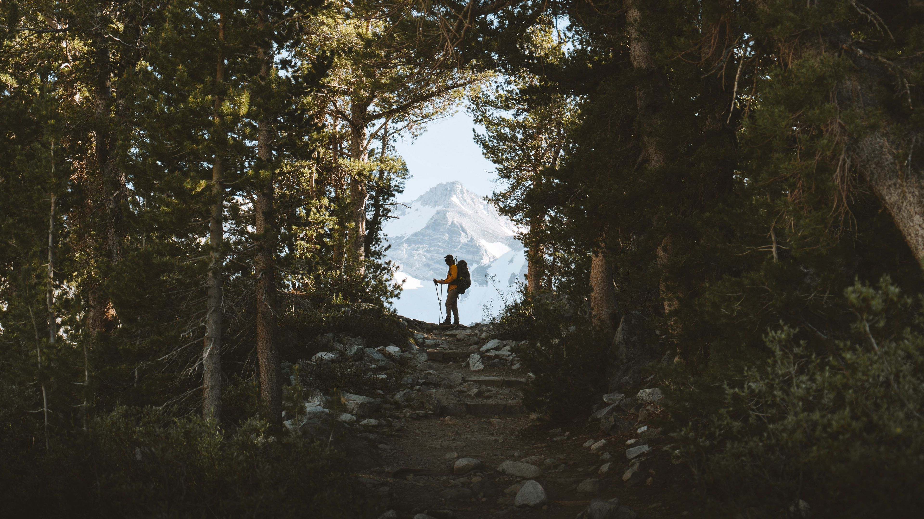 Tourist silhouette forest 4k wallpaper